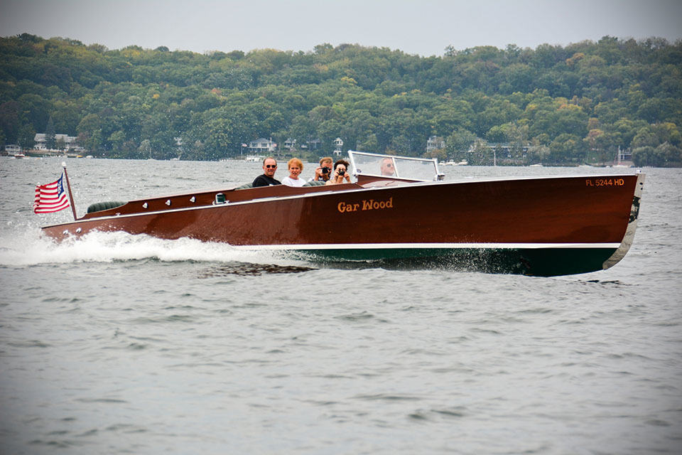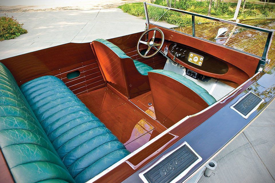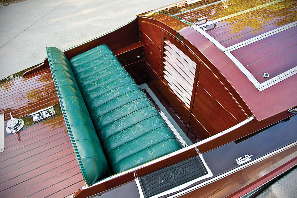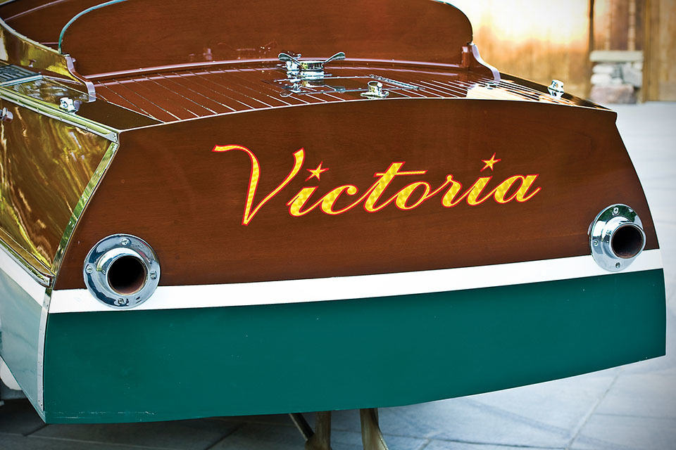 under the hood is a Chevrolet-based big block ‘marinized’ V8 with a reduction transmission, hooked up to a large propeller, giving this new-old Baby Gar the handling characteristics of the original, while providing ample speed so as not to dampen your boating enjoyment. actually, there aren’t much modern amenities needed for this pure, modern-day boating experience, but it does come fitted with a Clarion stereo with integrated CD player (kind of a mismatch addition, if you ask me) and a bow thruster for ease of dockside handling. the sale of the 1990 Gar Wood 33′ Baby Gar “Victoria” also includes a custom-built triple-axle trailer for transferring this new love of yours from your home to the waters and vice versa.