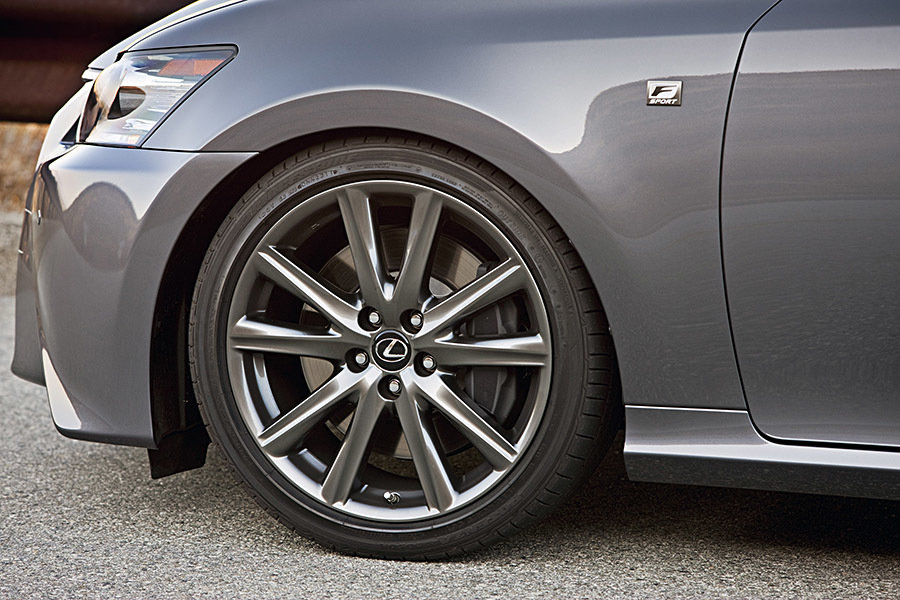 The GS 350 RWD with F SPORT package will be exclusively equipped with 19-inch staggered width wheels paired with 235/40/19 front and 265/35/19 rear tires, the widest rear tires ever on a Lexus sedan. The wider width wheels allow for a sportier look, and will also help provide added traction.  All-wheel drive (AWD) models will be paired with 235/40/19 all-season tires in the front and rear.