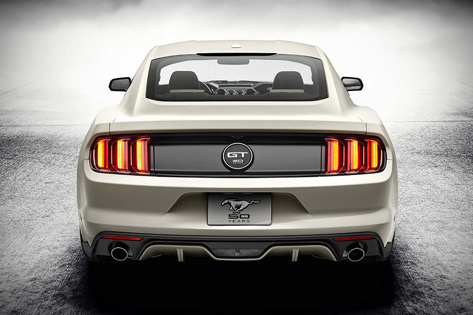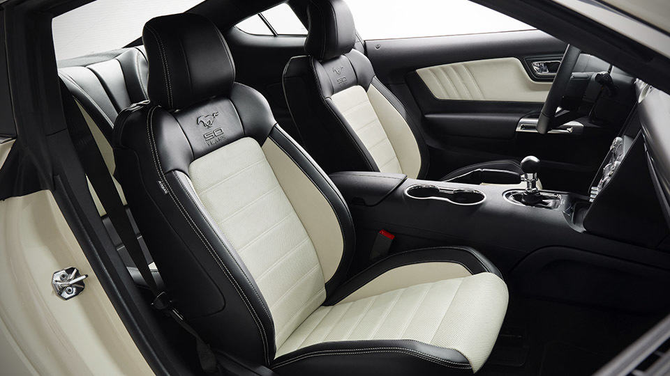 in the spirit of the 60s which the Mustang was born, this limited production ride will wear some discreet chrome elements in and around the car, along with distinct louvered rear quarter windows not found in any other Mustang. other visual elements that set this fastback apart includes a large faux gas cap at the rear, 50 Years on the GT name badge and on inside the cabin, it has a cashmere-stitched, leather-wrapped steering wheel and this same stitching can also be found on the instrument panel, shifter boot, center armrest, door inserts and seats. the two-tone cashmere and black leather upholstery resonates its 60s design influence, which surprisingly, still look pretty rad today. other things you can expect on the inside include the obligatory Mustang 50 Year logo on the seat backs and loop-carpet floor mats with cashmere stitching, and suede binding.