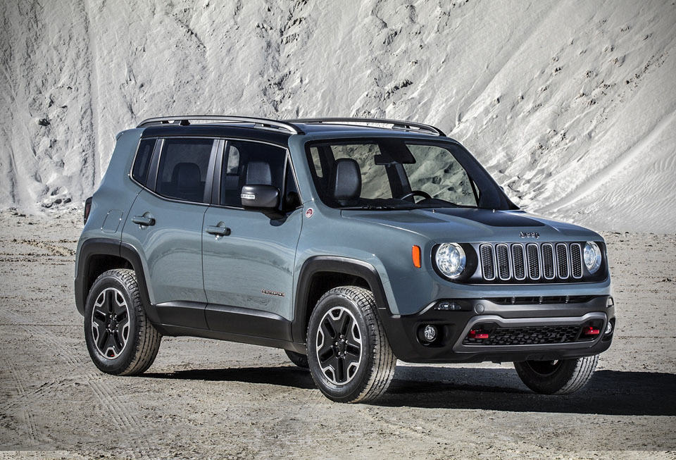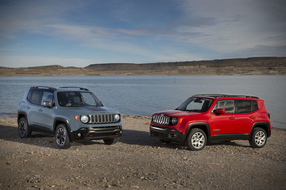 our eyes will be on the Trailhawk version which is a 4×4 model, trail rated, no less. the Trailhawk 4×4 offers standard Jeep Active Drive Low (20:1 crawl ratio), Selec-Terrain system with Rock mode, a pumped up ride height, plus a slew of extras including skid plates, sweet red front and rear tow hooks, unique fascias, 17-inch all-terrain tires, long wheel articulation, hill-descent control, and up to 19 inches (480 mm) of water fording, just to name a few. there are also other few neat details like My Sky open-air roof systems, Uconnect Access for quick contact with emergency service dispatchers and roadside assistance provider, or vehicle customer care center, Uconnect touchscreen radio systems, user-customizable 7-inch full-color instrument cluster display, plus up to seventy advanced safety and security features. powerful stance with aggressive wheel-to-body proportions come standard with all 2015 Jeep Renegade.