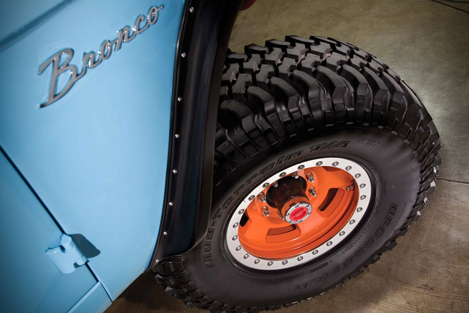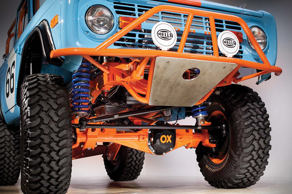 ride the ’66 Bronco like never before with the ’66 Bronco Heritage by LA-based car customizer Galpin Auto Sports. named as a Top 10 Car at SEMA by Motor Trend, this delightful truck is anything but the old horse. the Heritage wears the ever so familiar and iconic blue and orange livery that pays homage to Ford’s victories at the 1966 Le Mans 24 hour race with the GT40. powered by Ford 377 cid Stroker engine matched to custom tuned Edelbrock EFI and powertrain control system, Ford AOD transmission, custom made headers and exhaust system, this extreme new old off-roader now yields an impressive 540 horsepower.