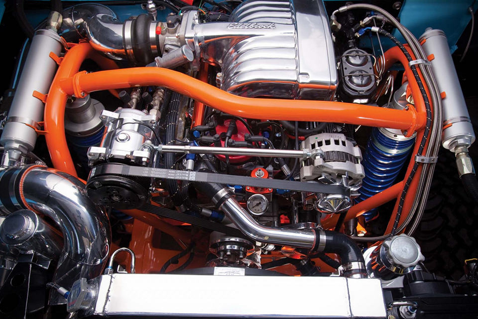 other enhancements include high pinion Dana 60 rear axle with super duty disc brakes, Dana 44 front axle with OX Air Locker and 3/4 ton disc brakes, custom long travel 3-link rear suspension, 4-link front suspension, King Performance Race Series coil-overs, 16″ Mickey Thompson Champion Beadlock Wheels by Alcoa shod with Goodrich Mud Terrain T/A tires, and various custom fabricated parts include front bars, skid plate, rear bars and more. on the inside, a fully integrated roll cage and support system are in place, along with Cobra Sport seats, Deist Safety 4-point belts and harnesses, custom rear bench seat, as well as Auto Meter gauges.