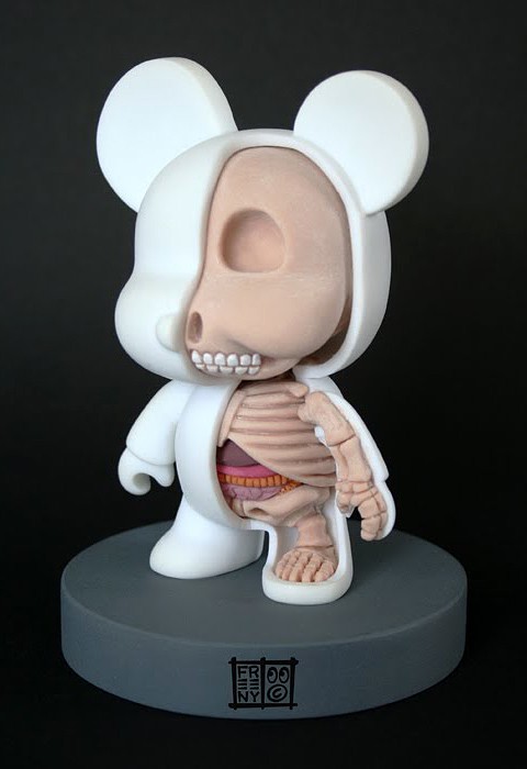 Freeny’s sculptures often feature iconic characters of our time, including Mickey Mouse, Nemo the Clown Fish, Hello Kitty, and the Qee Bear, among many others. Freeny’s works have a way of tickling our senses. the cutaway figurines showing the anatomy as imagined by Freeny can only be described as enormously artistically beautiful, yet nowhere near grotesque (which is normally associated with anatomy).