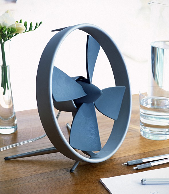 why should you use a fan when air-conditioning units are so affordable these days? because it consumes less electricity and there are small, portable versions that allow you to get the wind-in-the-face experience but most importantly, they have the potential to look beautiful and cool, which are qualities that are hard-pressed to find in air-conditioning systems. however, traditional fans do have their short fall, such as the protective grill (or guard), which is an eternal pain to clean up. that’s where the propello desktop fan by black+blum scores a plus: instead of hard plastic or aluminum blades, it has soft rubber blades, thus allowing it to do without the traditional guard, which gives it a clean, minimalist look. other highlights include a gorgeous pressure cast aluminum body, adjustable angle of airflow, and a high quality Johnson Electric Motor that offers a virtually silence operation. though such beautiful object does not come cheap, costing $138.90 to own but how can you deny yourself of such stylish fan? click through for a few more look.