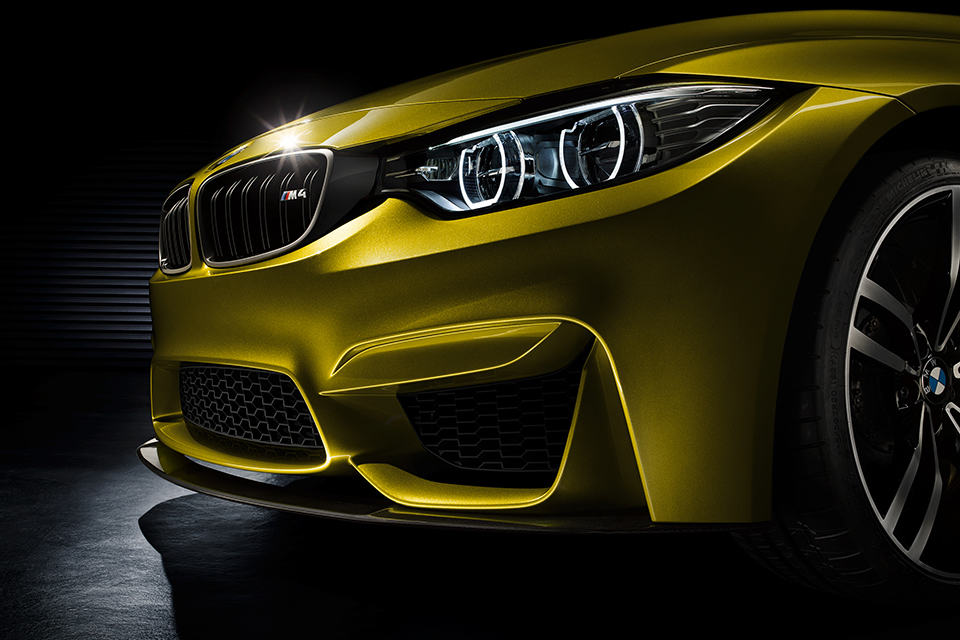 as far as hard specs are concerned, little is known about this “Aurum Dust” colored BMW Concept M4 Coupe – which means there’s no information of what goes under the hood or whatsoever. the wrap was taken off this striking concept on August 15 at the BMW opening media reception for the iconic annual Pebble Beach/Monterey automobile weekend. apart from that, what you get from the PR text is the usual marketing-meet-design materials with no effort to divulge anything further than what’s on the outside. we can see that its dynamically sculpted front has large air inlets – a hint of the power it will be blessed with – just below the iconic BMW M double bar kidney grill which in turn, is flanked by twin round headlamps featuring LED technology. CFRP (carbon fiber reinforced plastics), incorporated into the design to keep the weight of the ride down, is found in areas and parts such as the front splitter, the contoured roof, as well as the rear diffuser.