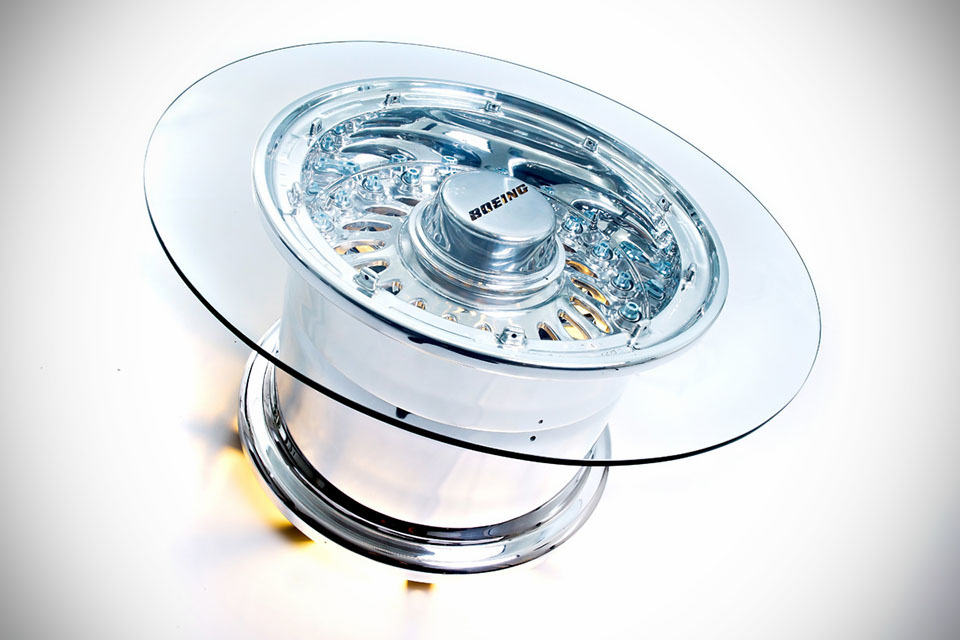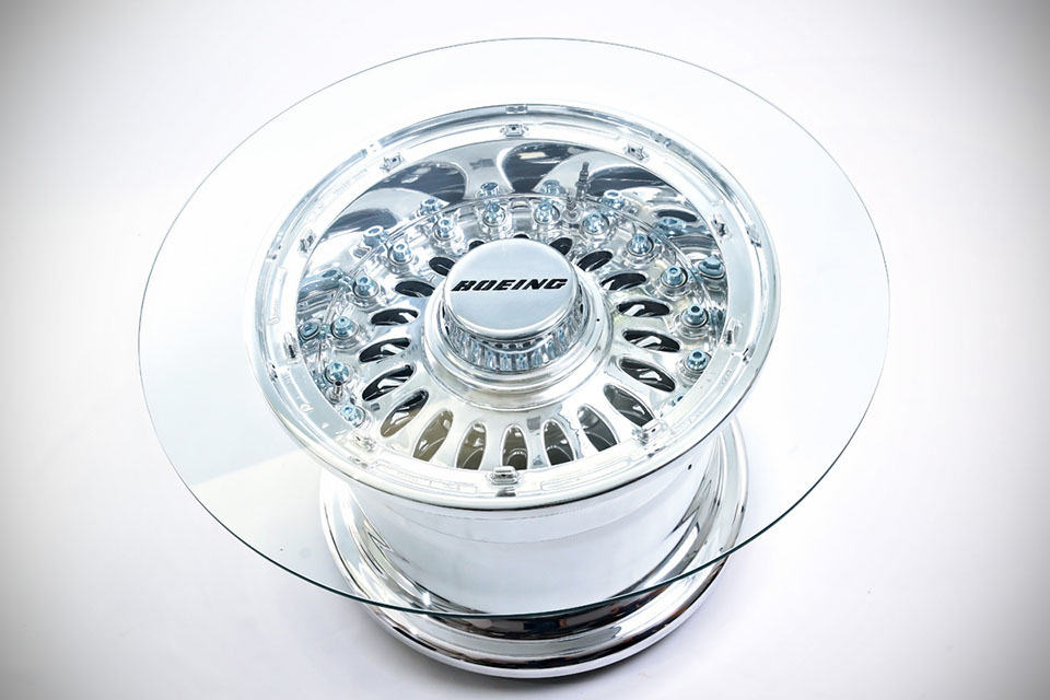 we have seen aircraft parts repurposed into stylish and functional furniture, but a coffee table made using an authentic Boeing 777 wheel (i.e. real wheel!) got to be the first. little is known about this beauty here, but apparently, it is an one-off item with a price of application (PoA) price tag on it. naturally, the coffee table started its life as a regular Boeing 777 wheel (but whether it had been used or not, remains an unanswered question) and repurposed into a coffee table’s base you see here. it went through a prep process, including a hand-polishing process which took no less than 150 hours to complete. after which, completing the whole table look is just the matter of placing a glass table top over this attractive, polished alloy wheel.