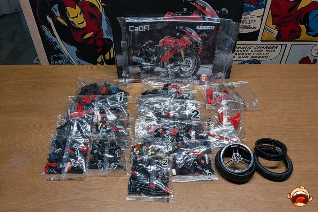 The 1,043 pieces are separated into 16 baggies and spread across two numbers, namely 1 and 2. In addition, there are two unnumbered bags: one for a special molded part (the nose cone with windshield and headlight unit), and one for flexible rods and a rubber band. There are 6 bags of 1, and 8 bags of 2, and this being a motorcycle, expect a lot of small elements.