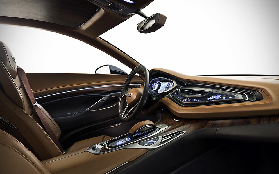 other features include massive 22×9-inch aluminum wheels, large ceramic brakes with Cadillac monoblock calipers, bucket seats, reclinable rear seats, a front-mounted camera, a high resolution display delivering essential information to the driver, a concealable 10-inch navigation touchscreen, and a unique valet feature for the rear bucket seats. with the latter, the front bucket seat slides 10 inches forward, while the rear bucket slides about 4 inches forward, allowing the would-be rear passenger ease into the seat. once seated, the seat would slides the passenger back into position.