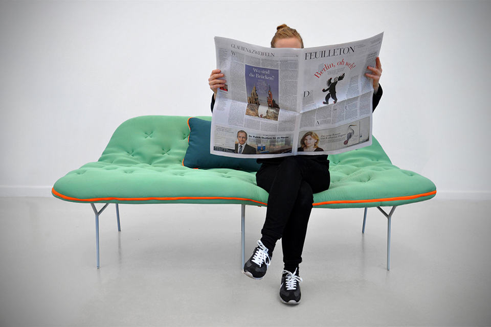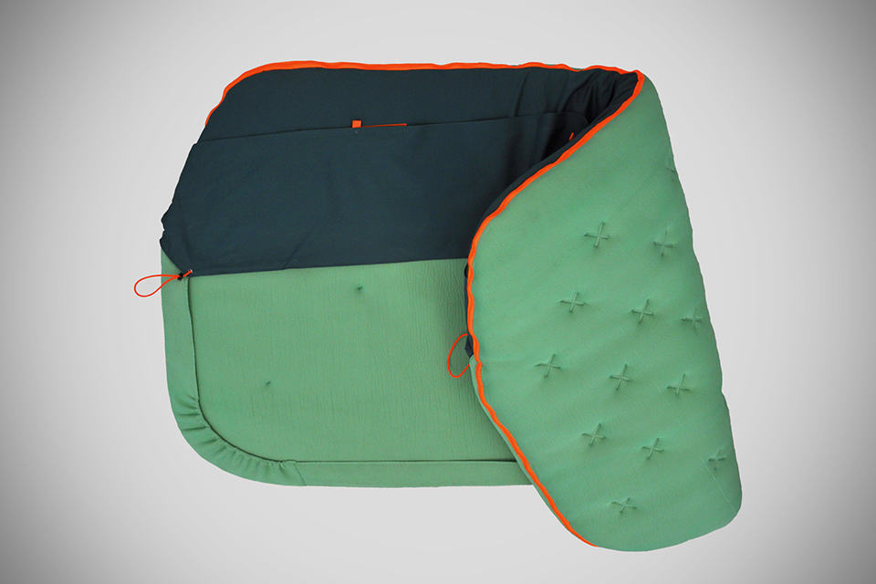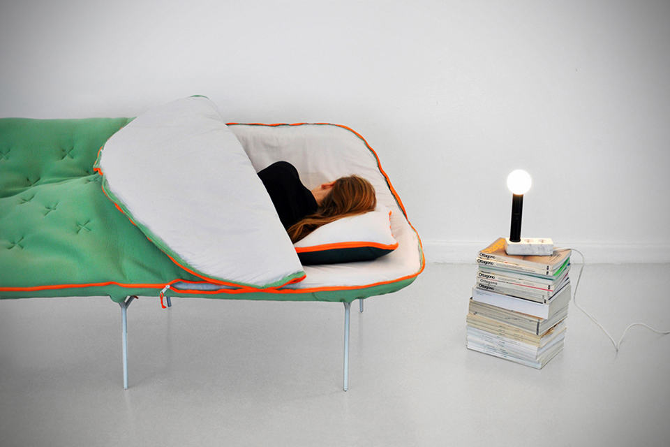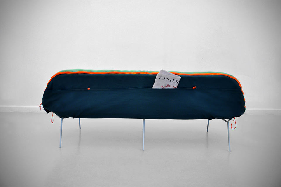 feel like snuggling up in a cosy sleeping bag but yet don’t want to be disconnected with the creature comfort of your humble abode? well, if designer Stephanie Hornig had her way, you probably could. Hornig created this particular sofa/daybed, aptly dubbed as Camp Daybed, as part of her final-year project at the University of the Arts in Berlin. the concept is pretty straight forward: to bring the great outdoors into your living area. the Camp Daybed is essentially a sleeping bag with legs, which you can use as a sofa in the day and slip in for a good night sleep. the padded 3D-knitted fabric and cotton sleeping bag goes over a comfy mattress which sits over a steel frame that is ‘dismountable’ for easy transportation and storage. true to its tent-like intent, there is a portion of the sleeping bag that hangs over the low backrest of the sofa (secured by rubber bands) that features pockets for storing pillows, magazines or whatever. awesome stuff, indeed and we certainly hope some furniture maker picks it up and make it a reality. perfect for those seeking the feeling of camping without the annoying insects (mozzies, especially) or for the man who just got booted out of the bedroom by his spouse. click through for a few more look at the Camp Daybed by Stephanie Hornig.