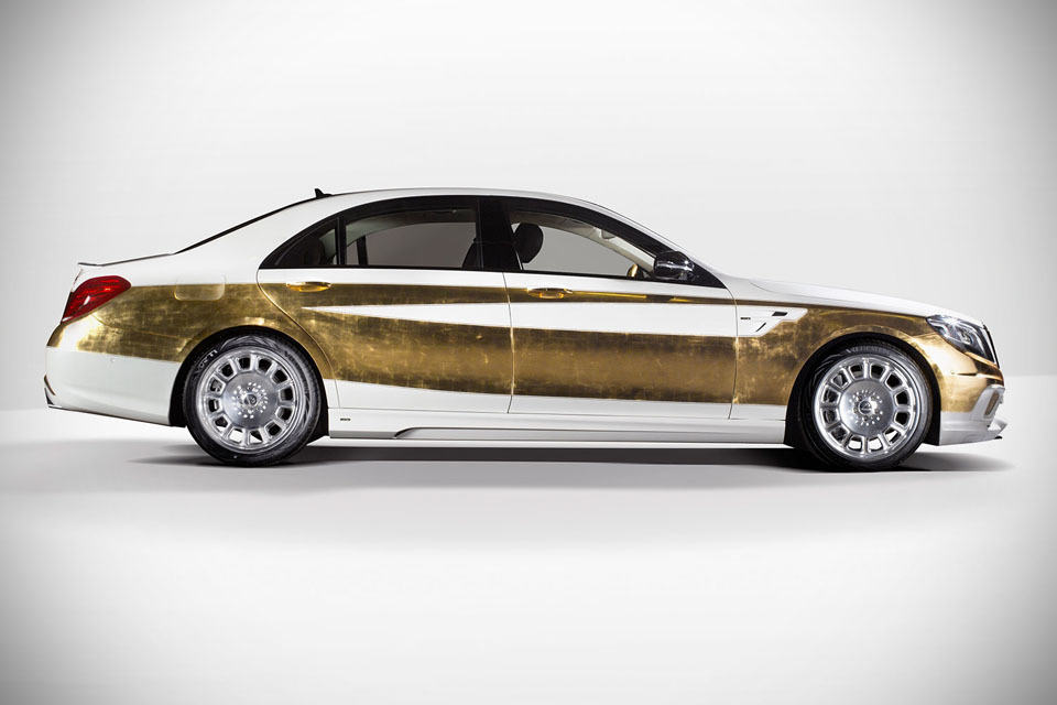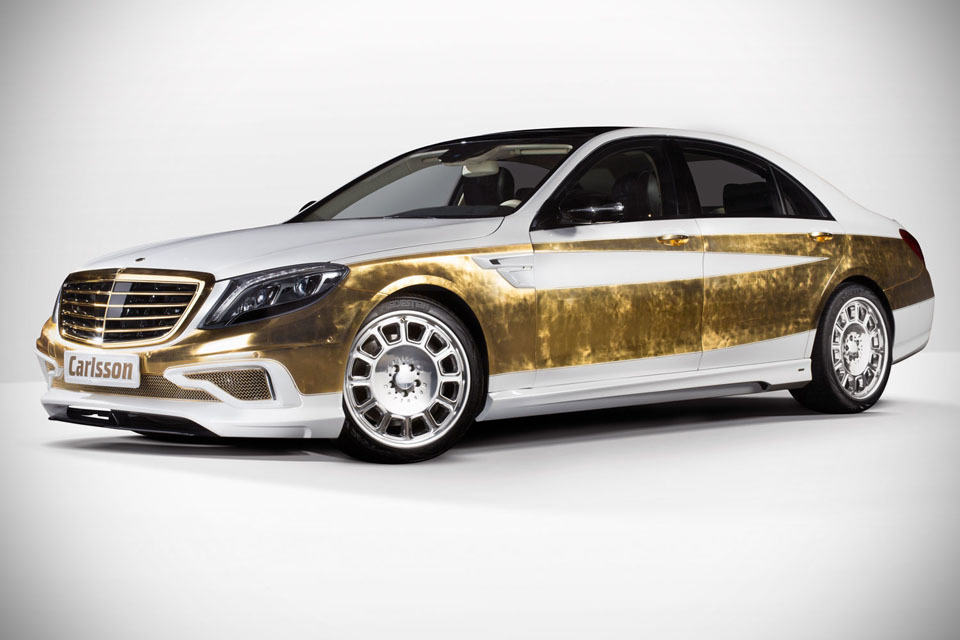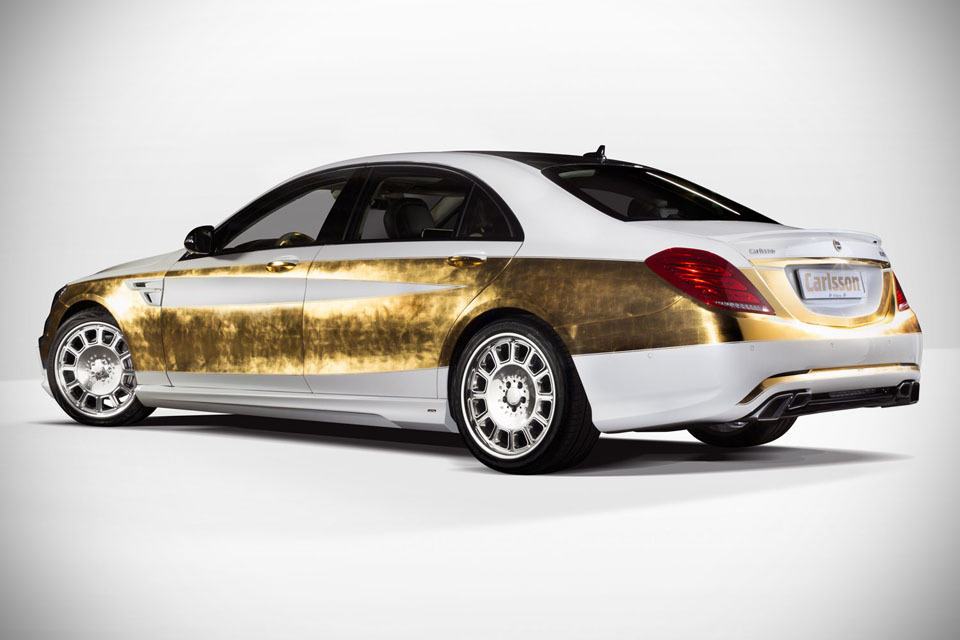 Mercedes-Benz does not represent the most opulent in the world wheels, but for lovers of the new S-Class who crave for a touch of opulence, German tuning specialist Carlsson has just the ride for you: the Gold Trimmed Carlsson CS50 Versailles. but why gold trimmed and not the whole damn car? because the gold treatment you see on the exterior is the composition of 1,000 sheets of wafer-thin gold leafs – not mere gold finish – with 200 painstaking man-hours of application. this is the real deal we are talking about here. the gold leafs are place on suitable prepared surface, intentionally in an irregular pattern known as Roman Association to arrive to what you see here.