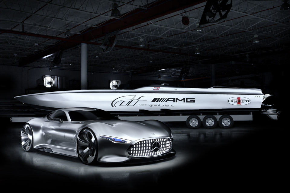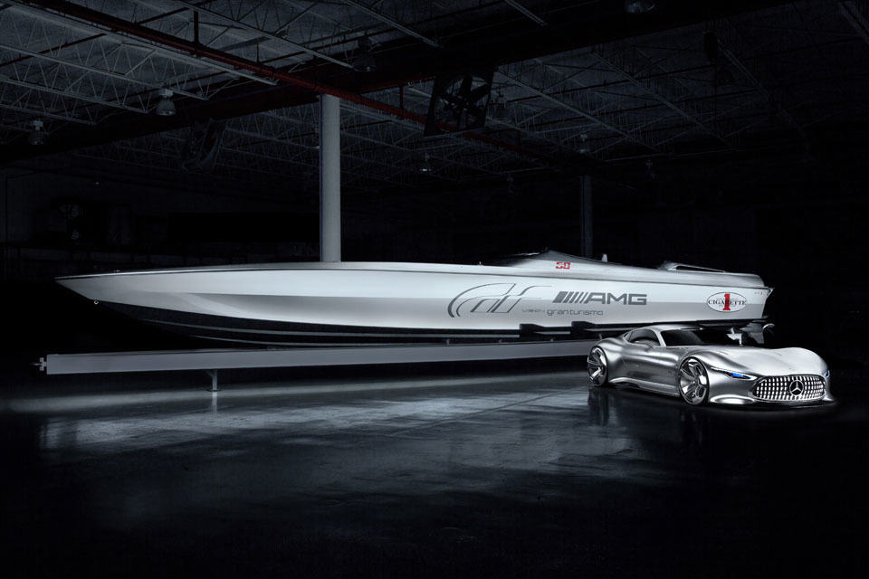 another year, another collaboration concept boat from Cigarette Racing and Mercedes-AMG but this time, there is another party involved, and that’s Polyphony Digital, the creating studio of the legendary racing game franchise, Gran Turismo. this fourth collaboration boat, dubbed the Cigarette Racing 50′ Vision GT Concept Boat, draws its design inspiration from the virtual-turn-reality Mercedes-Benz AMG Vision Gran Turismo which itself was featured in the latest installment of the Gran Turismo 6. the Cigarette Racing 50′ Vision GT Concept Boat is presented as a one-of-a-kind special model and also the most powerful production twin engine performance boat to ever came out of Cigarette Racing’s dock. this beautiful example, which is some 1000 lbs lighter than the standard spec counterpart, is pushed by twin 1,650 hp Mercury Racing engines to achieve a top speed of 140 mph (225 km/h).