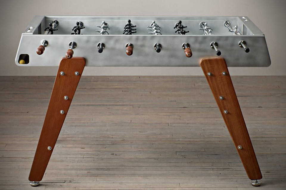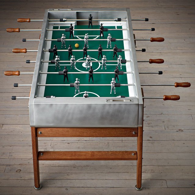 foosball is a game of football when you can’t get out and play, but to us, it is more than just a piece of leisure equipment – it is a piece of art and also a furniture that kind of adds character to any man cave or family game room. as such, it is only appropriate to grab the best looking work out there that oozes with style, so that for those times you ain’t twisting those sticks, you can just sit back, relax and admire the beauty, and we think this Competition Foosball Table from Restoration Hardware pretty much nails it as far form and functionality goes. crafted in Spain from electropolished stainless steel and matched to iroko wood-made legs for an extra touch elegance, this football table will find itself perfectly at home, indoor or outdoor and thanks to its integrated levelers, you can be sure it will stay level even on uneven surfaces such as grass.