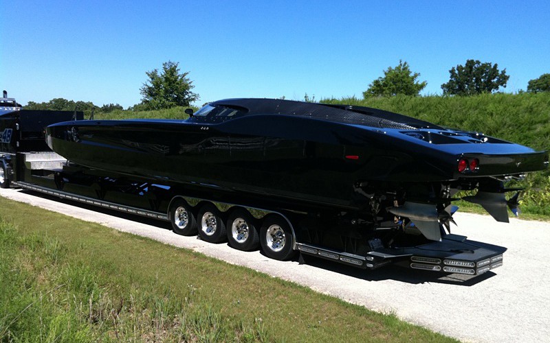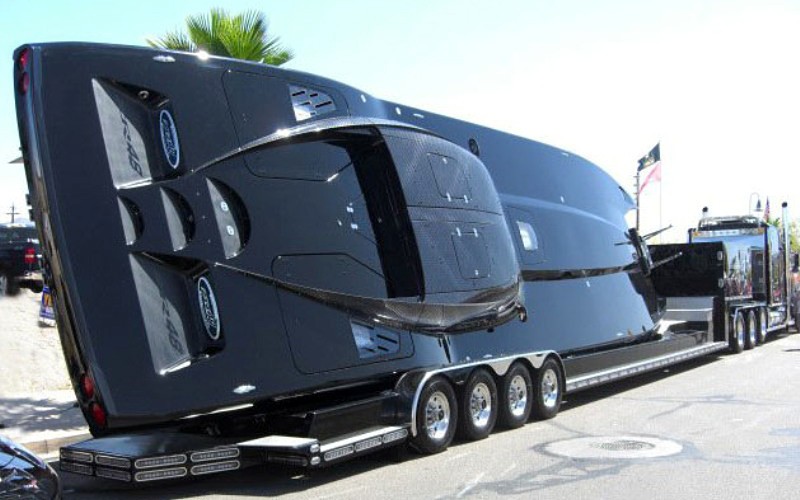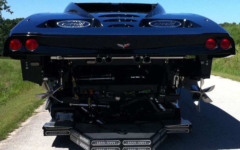 in fact, we think the exterior is so convincing that for a moment, we thought a Corvette has taken a dive into the river but of course, it didn’t. this Corvette is made for the water and looking all-so-stylish clad in a black paint job that Bruce Wayne’s alter-ego would die for. being such a wide boat calls for a matching trailer that will transport this handsome example to your nearest water, and that’s where the purpose-built trailer comes into play: it can safely tilt the boat to its side for transportation so that you won’t be needing an over-width permit to transport and the built-in air suspensions ensure that your Corvette boat ride safely and comfortably to wherever you are going. what’s more, onboard this stainless steel floor trailer is a generator, water tank, power washer, engine flush system, a DVD player, five televisions, a blinding 900+ LED lights and blue neon lights mounted to the frame above and below the frame rails – all which pointed to a potential on-the-road rocking party event. all you need is a decent DJ console and you are all set.
