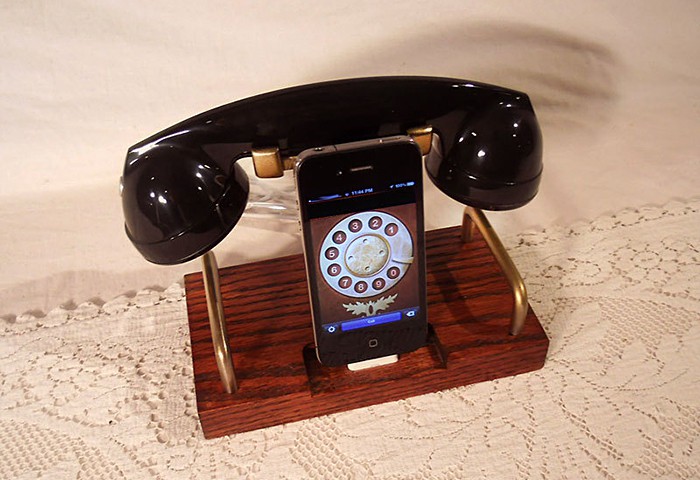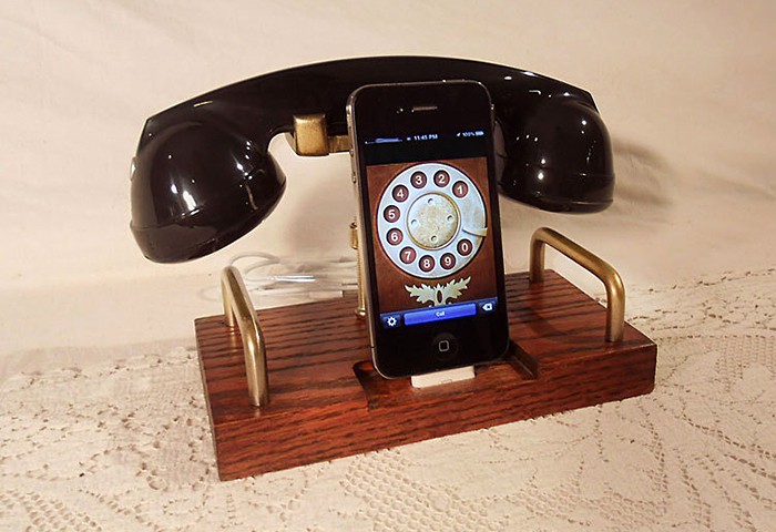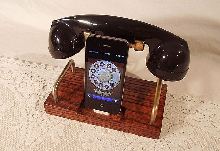 we were once mesmerized by Kirk’s (aka WoodGuy32) steampunk computers and peripherals and he is back to impress us again with this latest addition. though steampunk-esque iDevice docks are not new to Kirk’s domain but this particular example takes on a slightly different route: this one has a retro handset that makes the overall package look like the nostalgia dialing phone with a touch of steampunk for good measure. it could be the app shown on the phone that makes me feel that way but nevertheless, that huge black thing there, is unmistakably vintage.