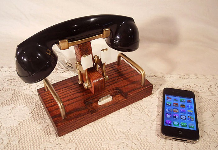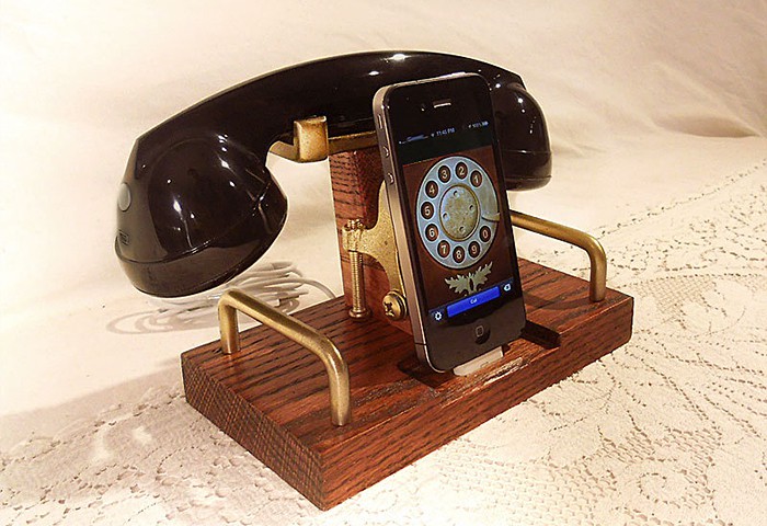 however, the big black handset is anything but vintage. it is in fact, a Bluetooth headset that lets you answer calls up to 30-feet away (about 10-meters) while your iPhone is being juiced at the dock. Kirk also has coiled wired model to suit purists who hate to go wireless. other specs include steampunk-esque brass bits and a solid oak base. oh, and it comes bundled with USB cable as standard. this custom iPhone/iPod dock can be yours for $72 but you’d better hurry cos’ it seems like Kirk only has one up for sale at his Etsy store. more look at this awesome iDevice dock after the break.