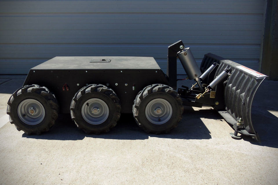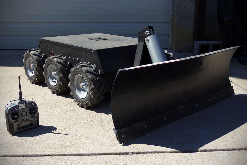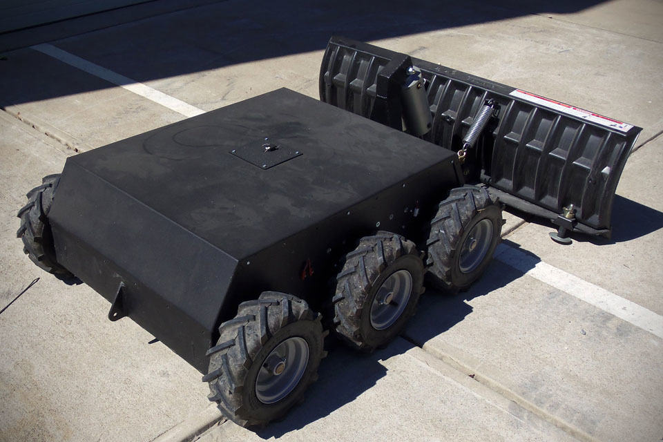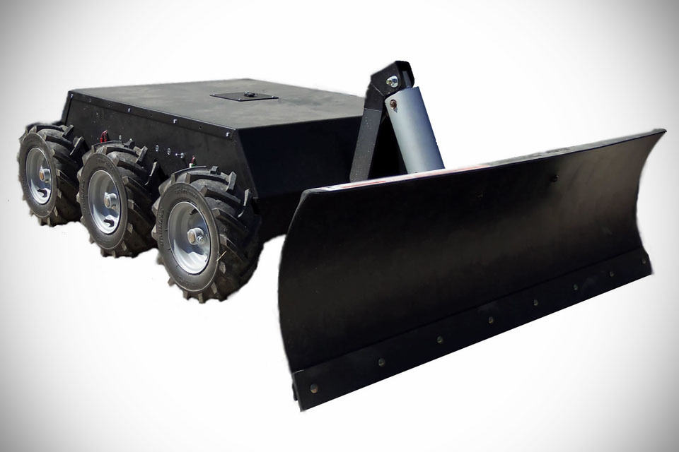 enclosed within the CNC plasma-cut aluminum chassis are six 24V electric motors, each driving a 13-inch tiller tire, juiced by two 12v batteries connected in series. no run time estimates were offered, but in any case, there is still room within this boxy chassis for two additional batteries for extended run time and added weight for traction. it comes standard with a Spektrum DSMX DX6i transmitter for control, so there is plenty of spare channels to go around for possible DIY hack like spotlight with remote on/off, and remote tilting the plow. yes. by default, the plow tilt is manual, which means braving the cold if adjustment is required. but the folks over at SuperDroid Robots can add that to the remote upon request (for a fee, of course).