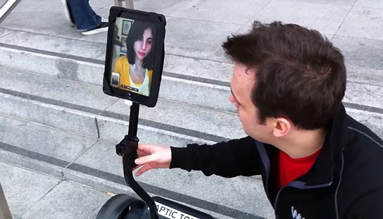 finally, mankind’s dream of being at two place simultaneously can be realized quite affordably and stylishly. for a little under $2,000, you can now pre-order Double Telepresence Robot developed by Double Robotics. though, due to overwhelming response, expect your personal telepresence robot to reach you sometime in early 2013. the Double uses an iPad to control the robot and to establish a two-way communication between the user and the environment which the Double is in. though at this point, it is worthy to note that you will need two iPads for it to work as intended by its maker. much like the one developed by Taptic Toys, the Double depends on two wheels for mobility and is kept upright by accelerometer and gyroscope. a motorized height adjustable body holds up the iPad, which you can adjust to keep a constant eye level with whoever is on the other end. maneuvering the Double is simply by touch control on the iPad on the user’s end and when the Double isn’t moving, a dual kickstands automatically deploy to keep it upright, thus conserving its power. check out a video of the DOUBLE Telepresence Robot in action after the break.