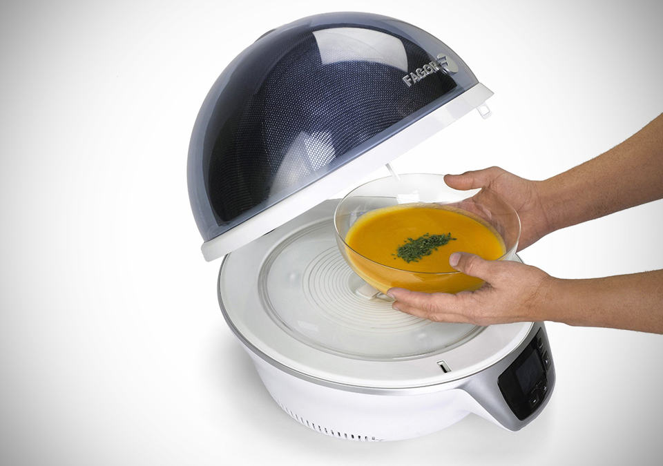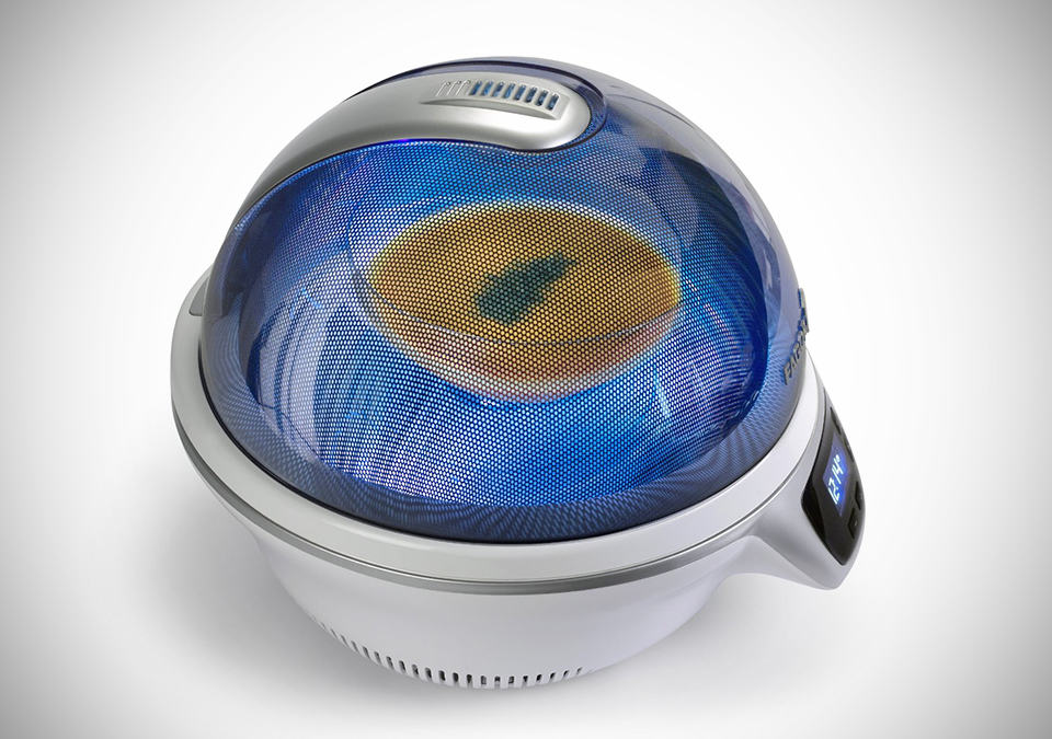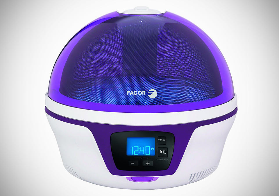 every once a while we come across a product that challenges the convention and invites the same old question: what the heck is that?! the Fagor Spoutnik you see here, is exactly that product that falls into the aforementioned category. at the first glance, there’s no way to know that it is a microwave oven. at its heart of this futuristic spherical kitchen appliance, it is still very much a dutiful microwave oven that does most microwave oven does: reheat, defrost and cook your food stuff with a choice of high or low heat. instead of the traditional rectangular white brick shape with horizontal swing door that has a limited view through its glass window, the Spoutnik sports a pod-like design with a domed, translucent glass lid that opens up to provide easy access and offers a clear 360-degree view of the happening within. additionally, the pop-top design also brings about ease of cleaning up after you are done with your cooking. a soft touch LCD display is the center of the control and like most microwave oven, it has the usual turnable mechanism (a 28cm or 11 inches for this instant) but the Spoutnik’s item stands out as one that comes with gridlines to aid you in centrally position your dish, as well as an illuminated turnable that lights up red when the cooking starts and changes to blue when the dish is all set. the Fagor Spoutnik comes in three colors: Blue Odyssey, Green Flash, and Ultra Violet and is available now for £179 a pop (approximately US$288).