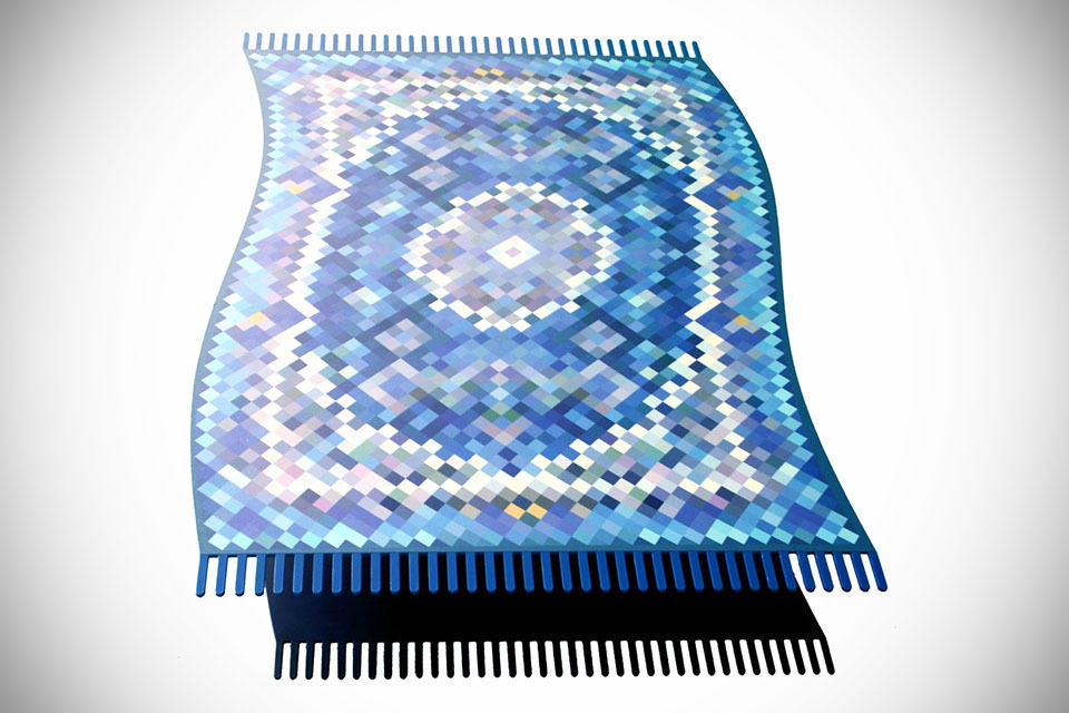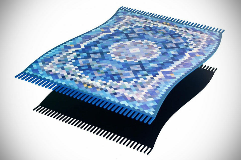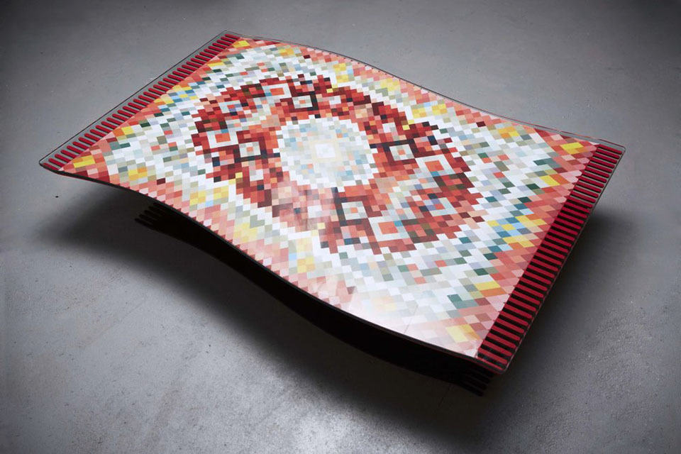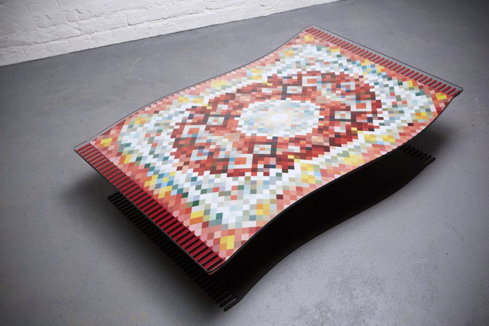 while we heard someone is the process of working on a real flying carpet, our normally logical mind tell us it ain’t going to happen (it might be rumor, if we might add) and with that in mind, the Flying Carpet Coffee Table seems like the next best option if you can’t stop fantasying about One Thousand and One Nights, or you simply have an Arabic-themed decor that will be a good fit for this rug-style coffee table. of course, this table is no rug; it is designed to look like one which the flowy form and a base that masquerades itself as the shadow of the rug works together to complete the illusion. well, we must say it appears to be pretty convincing, at least from the images. the table is made of mild steel, power coated and adorned with pixelated print in the fashion of a typical Persian rug.