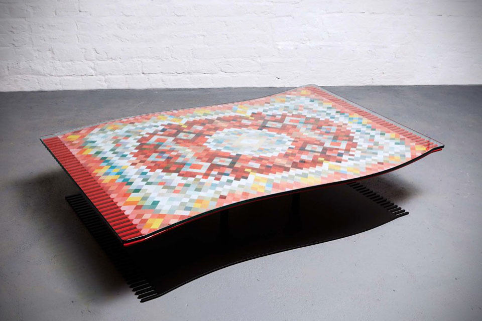 while we heard someone is the process of working on a real flying carpet, our normally logical mind tell us it ain’t going to happen (it might be rumor, if we might add) and with that in mind, the Flying Carpet Coffee Table seems like the next best option if you can’t stop fantasying about One Thousand and One Nights, or you simply have an Arabic-themed decor that will be a good fit for this rug-style coffee table. of course, this table is no rug; it is designed to look like one which the flowy form and a base that masquerades itself as the shadow of the rug works together to complete the illusion. well, we must say it appears to be pretty convincing, at least from the images. the table is made of mild steel, power coated and adorned with pixelated print in the fashion of a typical Persian rug.