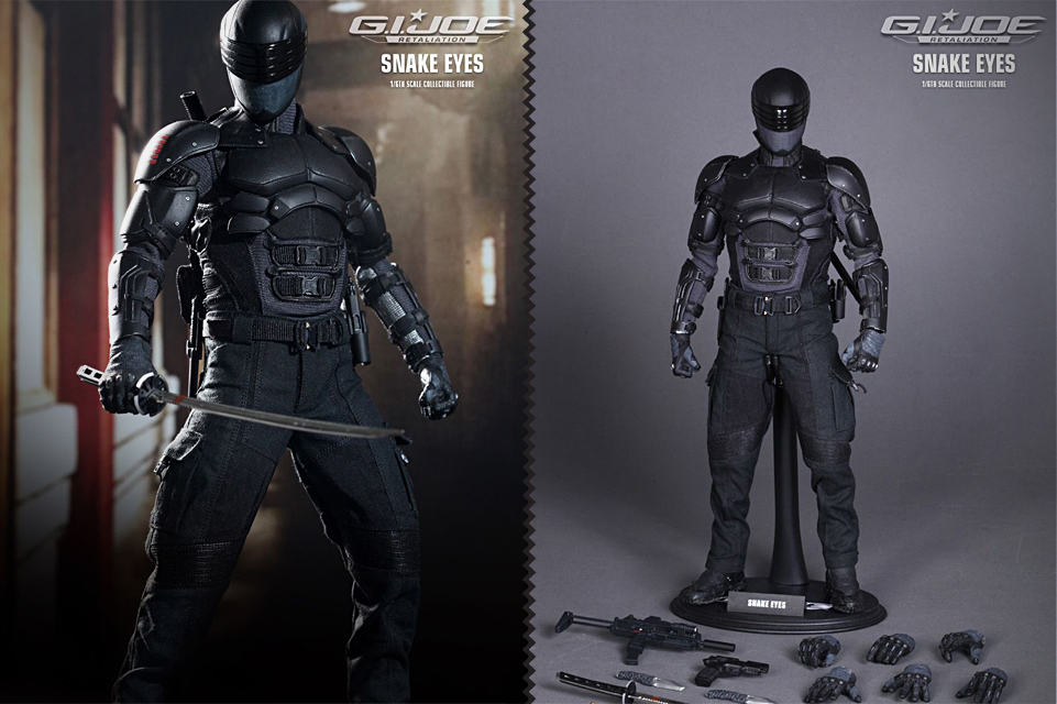 no. what you see here is not a screenshot from the second big screen G.I. Joe flick, G.I. Joe Retaliation but a realistically sculpted 1/6th collectible figure of the character Snake Eyes. the G.I. Joe Retaliation Snake Eyes Sixth Scale Figure is the first collaboration between Hot Toys and Hasbro and it features movie-accurate details crafted based on the image of Snake Eyes in his black “military ninja’ outfit in the movie. standing approximately 30 centimeters (12 inches) tall, the Snake Eyes figure features Hot Toys’ TrueType body with over 30 points of articulation, interchangeable palms and upper body. the collectible comes with five pairs of hands – including a pair of fists, palms for holding gun, palms for holding swords and a pair of relaxed palms – a black ‘military ninja’ bodysuit with armor on upper body and arms, one black helmet, a pair of black boots, Japanese-style metal swords with sheath, a pair of daggers with sheaths, submachine gun, one pistol complete with holster and a figure stand with Snake Eyes nameplate, as well as the movie logo. you can pre-order yours for $194.99 each with estimated shipment to be in May 2013. in the mean time, treat yourself to some imageries of the Snake Eyes Sixth Scale Figure after the break. oh, in case you have yet to catch the trailer, you can view it in the embedded video further down the post.