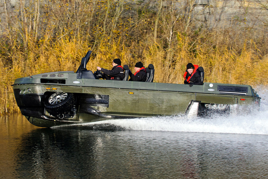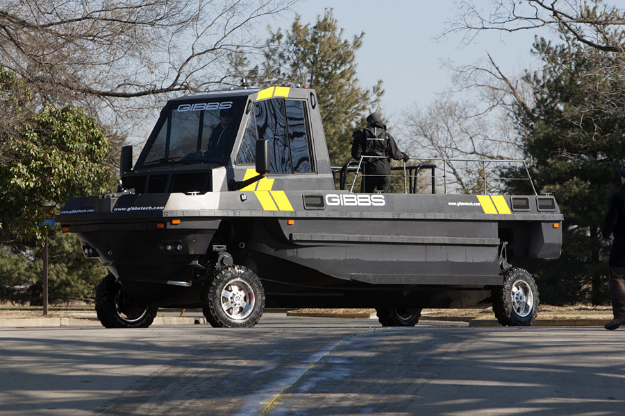 let’s get it straight: we all know amphibious vehicles and we also know that they ain’t made for speed, both in or out of the water but the PHIBIAN by GIBBS AMPHIBIANS begs to differ. touted as the largest wheeled High Speed Amphibian ever developed, it is capable of highway speeds on land and in excess of 48 km/h (30 mph or equivalent to 26 knots) on water, while ferrying up to 1,500 kg of cargo or 15 passengers. it is equipped with a 500 horsepower (368 kW) twin turbo diesel engine for road duties and a twin jet drives propel it through the water. together with virtues like high ground clearance, steep approach and departure angles, and selectable 4WD, makes this rolling boat a true all-terrain machine. perfect for first responders and rescue but if you have an insanely huge bank account, we don’t see why it couldn’t be your next ride for your hunting or fishing trip. hit the jump for a gallery (and a video) of the PHIBIAN.