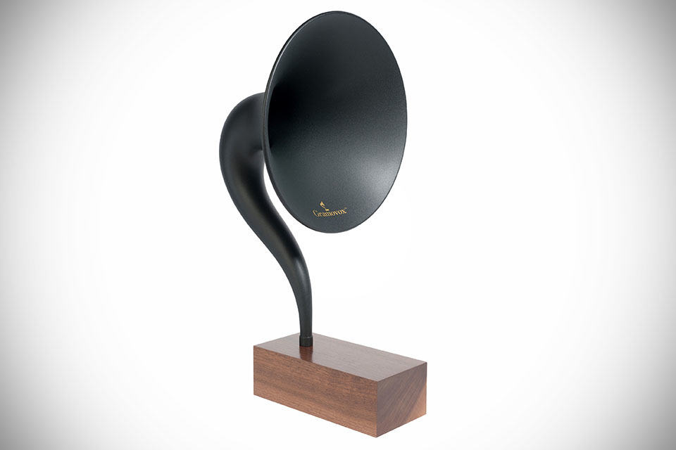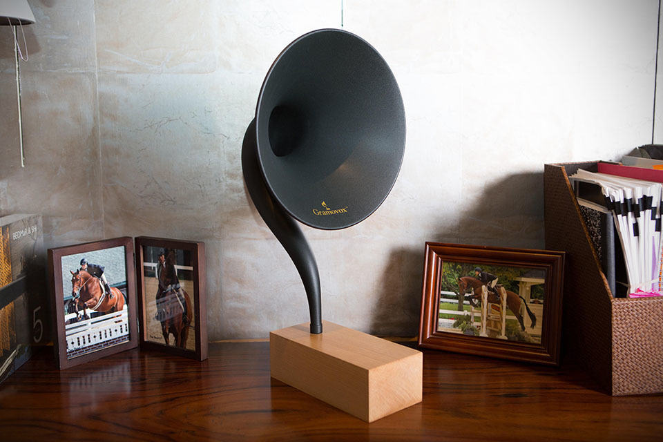 Gramophone horn-style speakers for iPhone are not new, but they are generally, based on natural amplification. we won’t blame their creators, cos’ having a horn this huge really tempts one to go all natural, but not the Gramovox. not a chance. a couple dudes had a better idea: combining the proven acoustic of a gramophone developed in the 1920s with the modern electronics circuitry and Bluetooth connectivity, and the result is the Gramovox Bluetooth Gramophone. it is a modern day gramophone, bearing all the nostalgic sounds you come to know but with the convenience of Bluetooth audio streaming. perfect? i heard you say? you bet it is. the setup consists of two parts, the nostalgic horn shaped like the Magnavox R3 horn speaker of the 1920s and a clean, minimal wooden base that houses a specially designed circuit board, Bluetooth 3.0 chip, a magnetically-shield 66mm cone driver and a 3,300 mAh lithium-ion battery that’s good for up to 15 hours of playback.