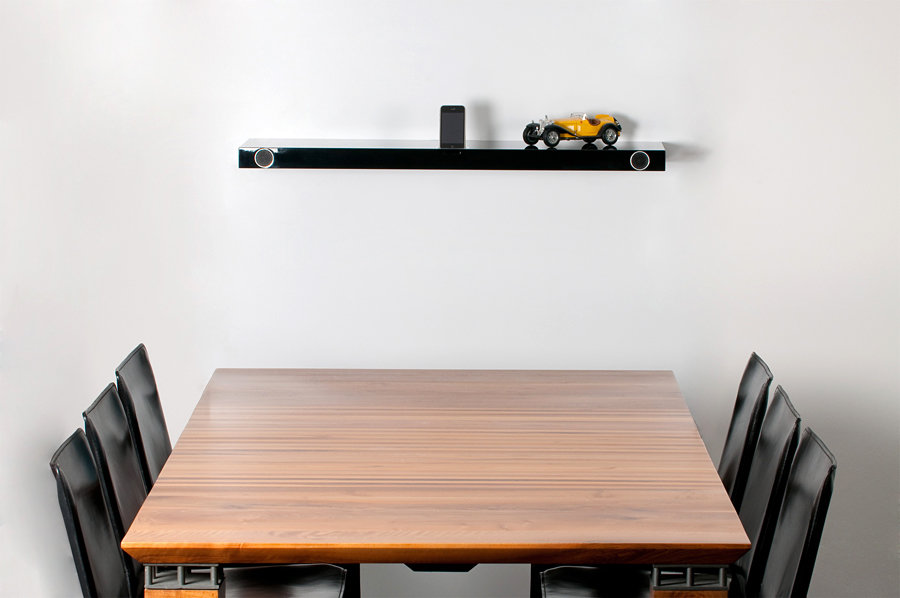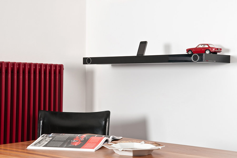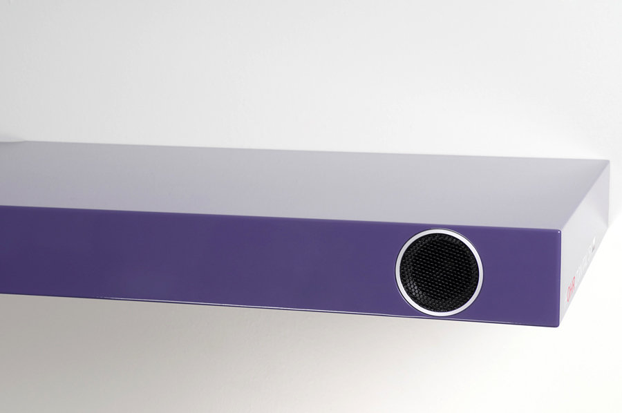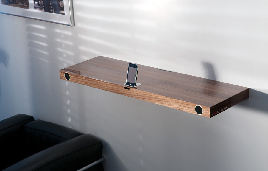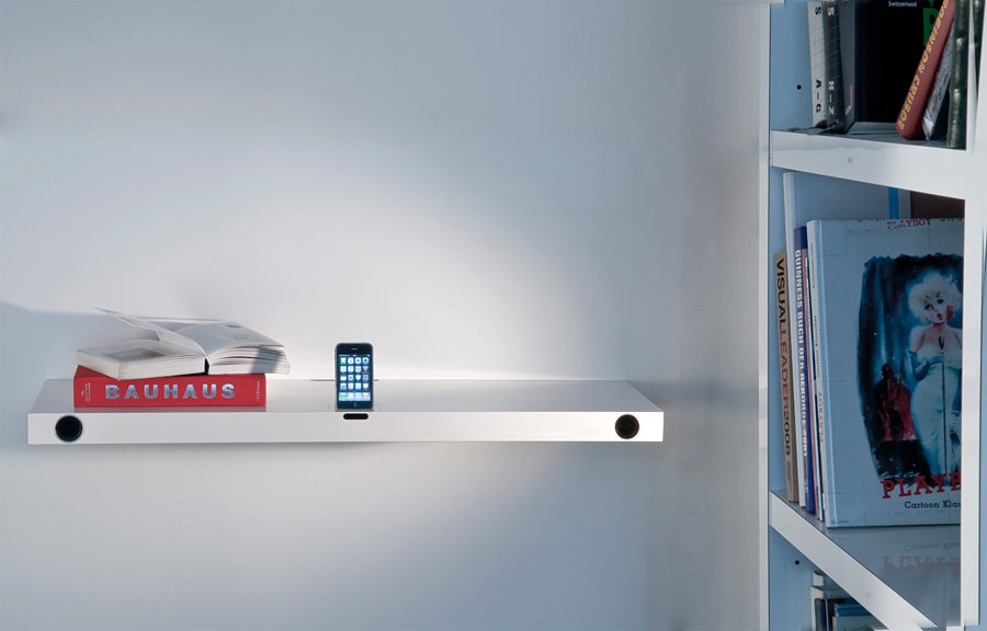 we love sound dock but if its going to ruin our lovely interior decor, then it is uncool to us. however, if the sound dock that we speak off happens to be an integrated part of your furniture, such as a shelf like this strangely named HOHRIZONTAL 51 SOUNDBOARD, then we are talking style. the name itself does not readily let you in that it is actually a minimalist wall shelf integrated with a dock for your iPod or iPhone and packed with built-in sound system. features include a shelving space with a load capacity of up to 25 kg (55 pounds), charging function for your iDevices, remote control, 2 x 50w of amplified power with overload protection, line-in and USB audio, and composite video out for hooking with your computer or TV. what can i say? a speaker system that has more sound and less distraction, and it is totally functional as a furniture. available in a choice of color options, including Walnut, White, Red, Mallow, Black and Anthracite, this minimalistic shelf-sound dock hybrid will set you back at £599 each or around US$949. hit the jump for a few more images of the HOHRIZONTAL 51 SOUNDBOARD.