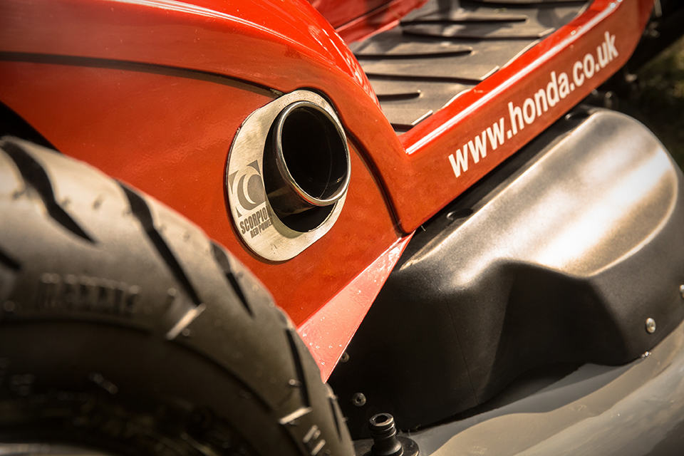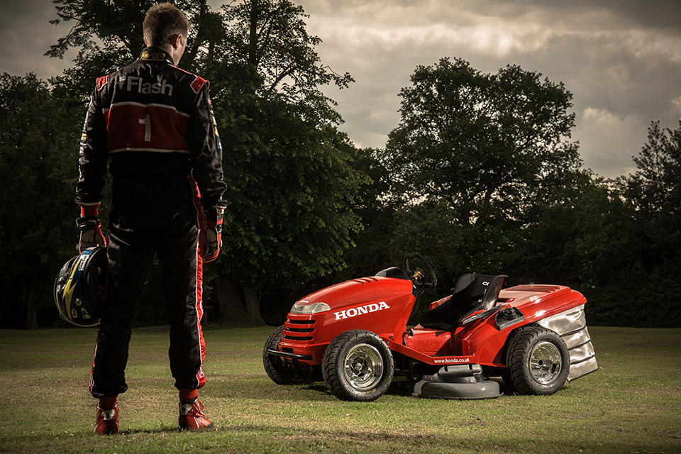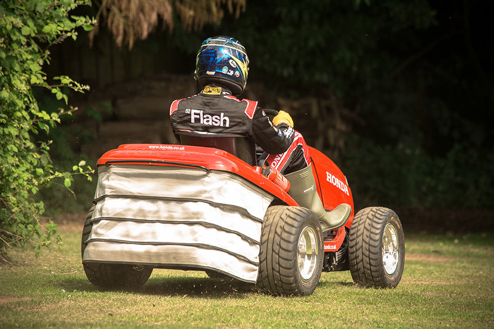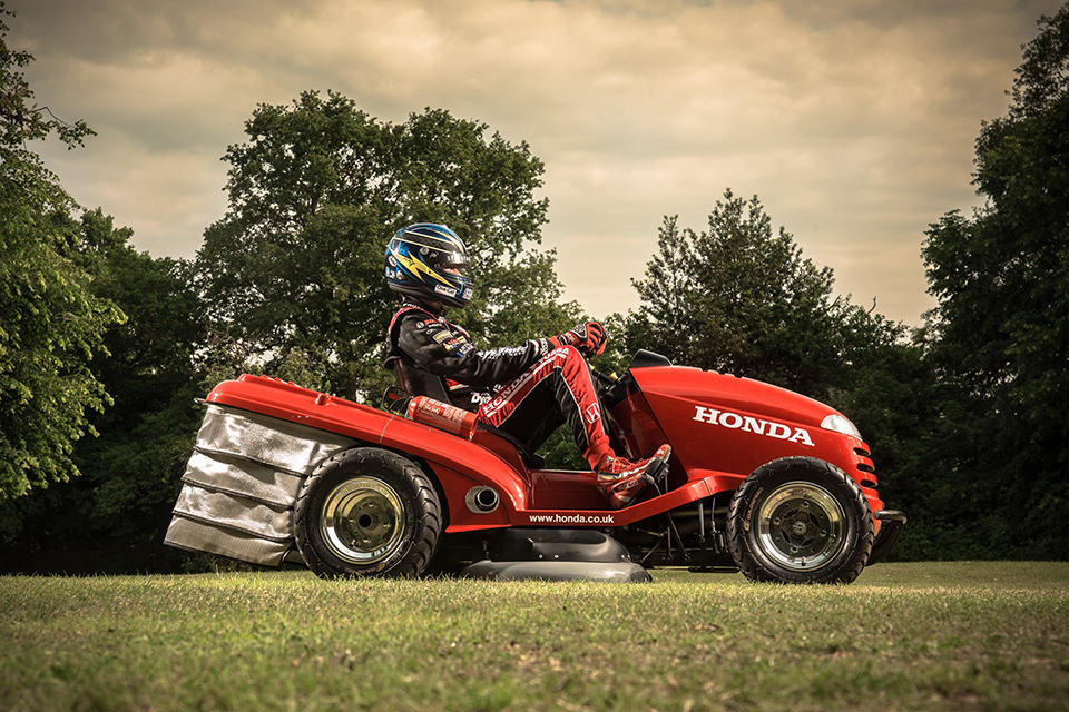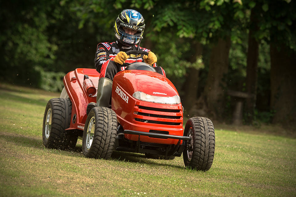 when it comes to lawn mower, a little brute horsepower won’t hurt, but speed is almost never on the agenda. but the Honda Mean Mower you see here, defies the convention. developed in collaboration with Team Dynamics, Honda UK’s British Touring Car Championship partner, this lean mean lawn trimmer puts out 109 horses and 96 Nm of torque from its 1,000cc Honda VTR Firestorm and is fitted with six-speed gearbox which enables it to sprint from 0-60 mph in just 4 seconds and well on its way to a 133 mph (214 km/h) top speed. while externally, it retains the Honda HF2620 Lawn Tractor body that it is based on, other bits are all but new. it is given an all-new custom chromoly chassis, a Scorpion exhaust system (that gives it the incredible 130db scream at its peak), a Morris Minor steering rack, a custom-made paddle shift, a custom-made Cobra sports seat (no harness though), a bespoke suspension and ATV wheels wrapped in super-soft tires for optimum grip and handling on tarmac.