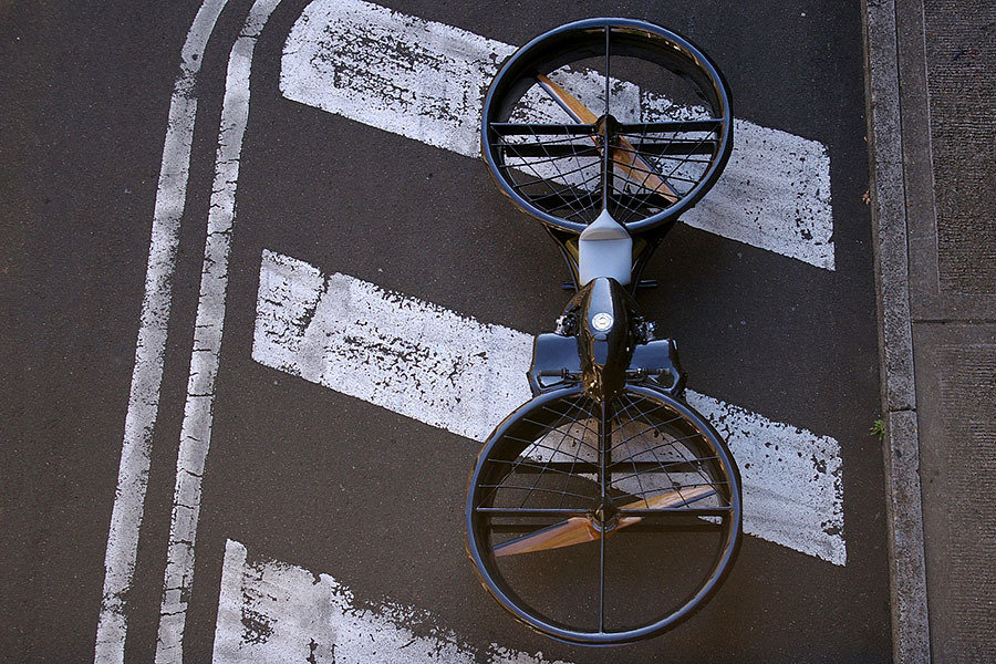 constructed from Kevlar reinforced carbon fiber with foam core frame that stretches between the two huge horizontal propellers, the Hoverbike has a central main body that looks like a motorcycle. hence, the rider or should i say, the pilot basically fly this baby in a bike-riding position and controls the vehicle via the handlebars. the Hoverbike works on the principle of counter-rotating blades similar to what the Chinook helicopter uses. basing on the principle of helicopter flight, this aircraft is thus capable of moving forward and backward just by the controls at the handlebars. however, no mention of whether straddling left and right are possible.