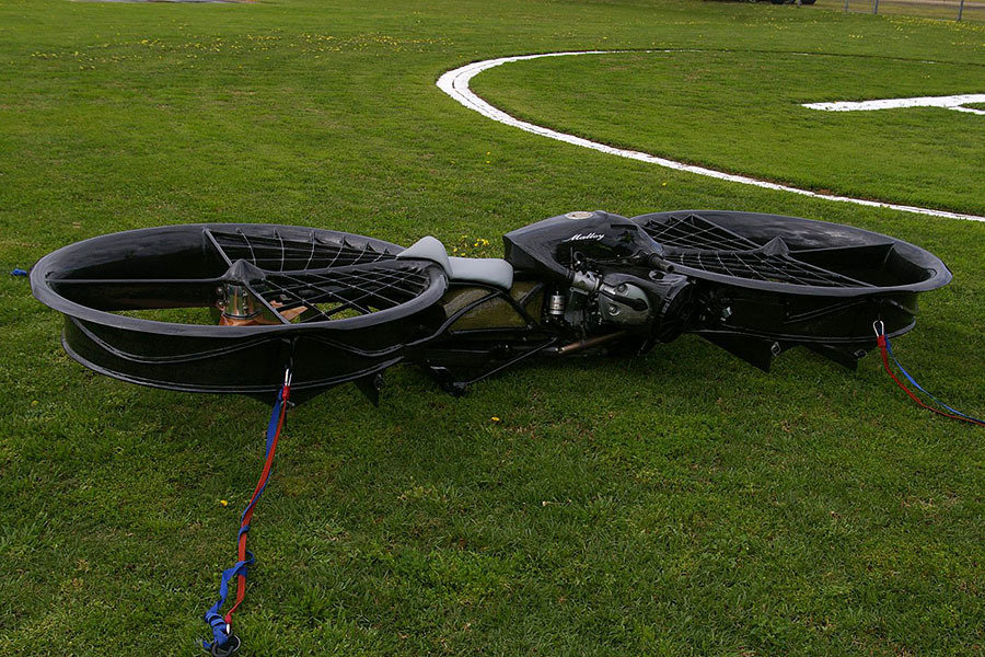 the 80 kW (107 hp) generated from a single 1,170 cc four-stroke engine is the driving force that gives this twin propellers set up a total thrust of 295 kg. however, autorotation is still missing from this vehicle at this point but to be fair, this is still a prototype and what Malloy has achieved up to this stage is already an amazing feat. other plans are in the works to further fine tune this machine and Malloy hopes to get the Hoverbike into “limited production” within a year and possibly a full production in another two years or so. he expects to make at least 100 units a year to enable the price of the Hoverbike to be around the region of $40,000.
