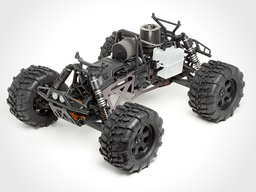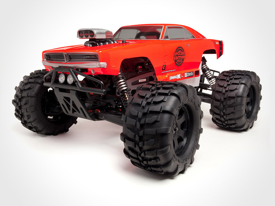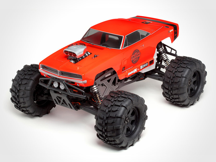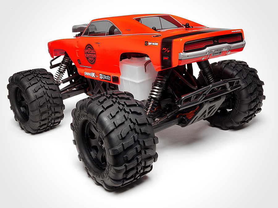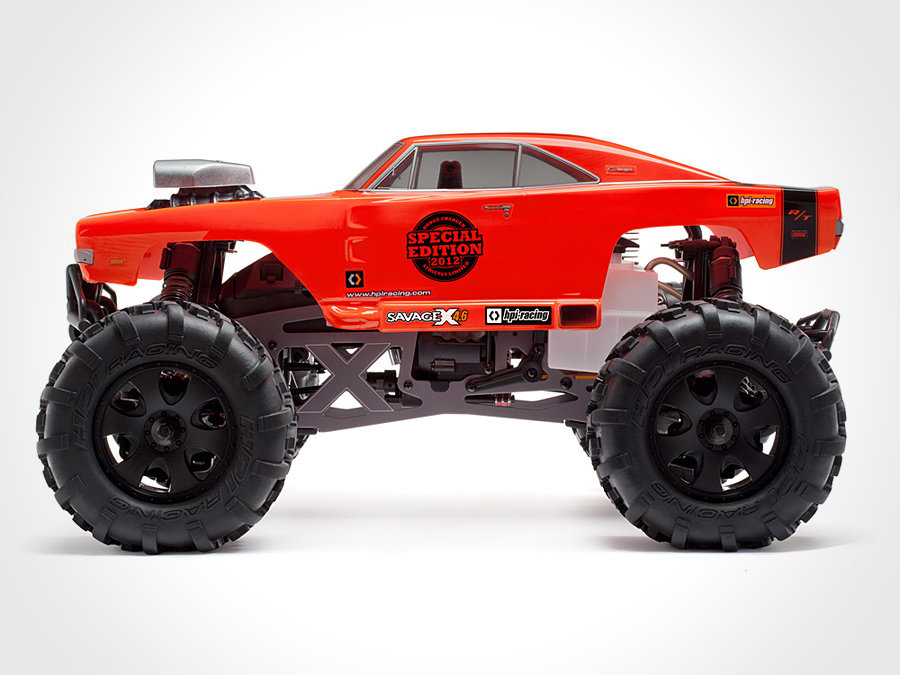 huge wheelies, big air stunts and going at extreme speed are pretty much made-believe stunts that you would see in Hollywood movies. trying those stunts not only put yourself and others at risk but it is most definitely going to wreck your precious ride and knocking out some trash cans and lamp posts in the process. instead, why not try those thrills that you dreamed of at a much smaller (and safer) scale – or 1/8 scale to be exact? say hello to HPI Racing Special Edition Savage X 4.6 RTR 2.4GHz radio control model truck cos’ this is the truck that’s going make your adrenalin pumping. it is 1/8 scale, so it is by no means small in terms of RC vehicles and it is powered by a Nitro Star 4.6 big block nitro engine that delivers nearly 3 horsepower screaming through all its four wheels, sending it to a top speed of 73 km/h (45 mph). this SE RC truck comes with an all-new Dodge Charger R/T shell, complete with a massive replica supercharger on its hood. the SE Savage has a limited production run of just 1000 units worldwide and each chassis is individually numbered. features expected include orange-anodized chassis parts, polished aluminum tuned pipe, aluminum Big Bore shocks with dual-stage springs, sintered bulletproof differential gears, dual fiber disc brakes, two-stage air filter, two-speed gearbox, black Warlock wheels, metal-gear steering servo and of course, the interference-free 2.4GHz radio system. the HPI Racing Special Edition Savage X 4.6 RTR comes fully assembled, so all you need is some nitro fuel and you are good to go. the HPI Racing Special Edition Savage X 4.6 RTR (Ready-to-Run) 2.4GHz with Dodge Charger will set you back at around £579.99 a set. tear past the jump for a small gallery.