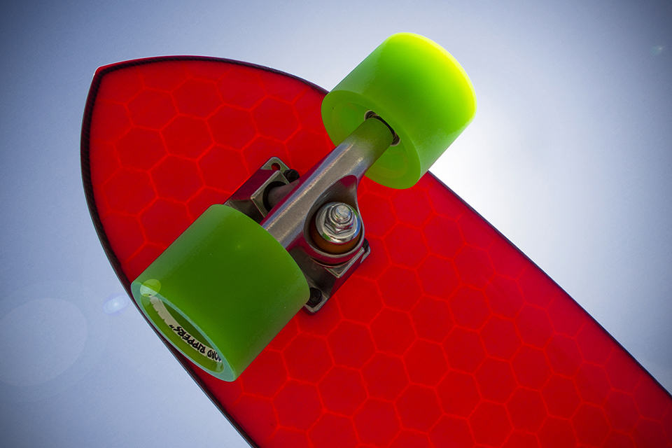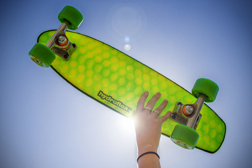 usually, skateboarders will never fail to get the rightful attention, however, if you ever need a boost in the look-at-me department, then look no further than the Hydroflex Hi-tech Composite Skateboards. seriously, if these funky colored (we are tempted to say psychedelic) skate decks don’t attract any attention at all, we don’t know what will. the honeycomb-patterned deck with radiating colors is more than just an eye-pleaser. behind it is a patented process know as the 3D-Glassing Technology, along with clever construction methodology which result in skateboards that are lighter than its wooden and plastic counterparts, much stronger and totally waterproof.