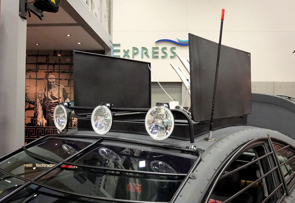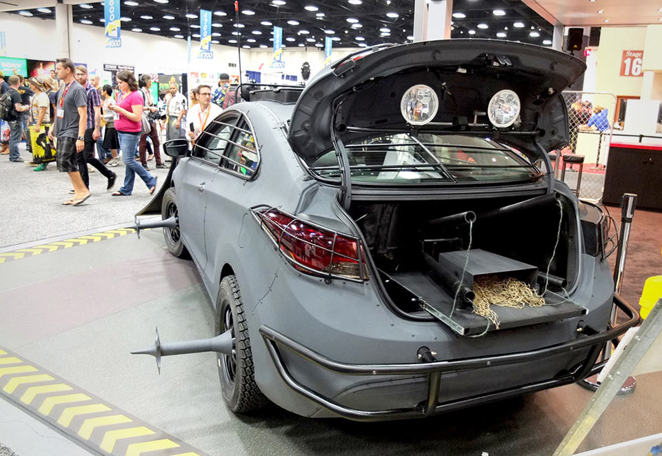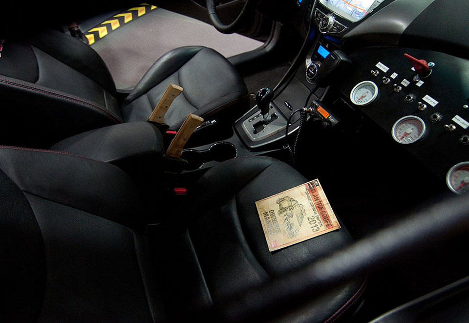 this Elantra-based Zombie Survival Machine may not be as roomy as a van or truck would be (sorry folks, we don’t think a pantry would fit in there) but it is no less potent, especially when you consider these features: a front-end zombie plow complete with spikes, all-terrain tires with long, protruding spikes, armored window coverings, a roof hatch, a trunkful of electric and pneumatic weaponry, front and back end floodlights, and a handy CB radio system for your communication need. in case you need to get out of the safety of your vehicle for a leak, grab a couple of machetes that are kept handy between the driver and the front passenger just in case you stumble upon any stray zombies. wrapping up the package is a limited edition “owners manual” that illustrates your coupe’s capability against the undead.