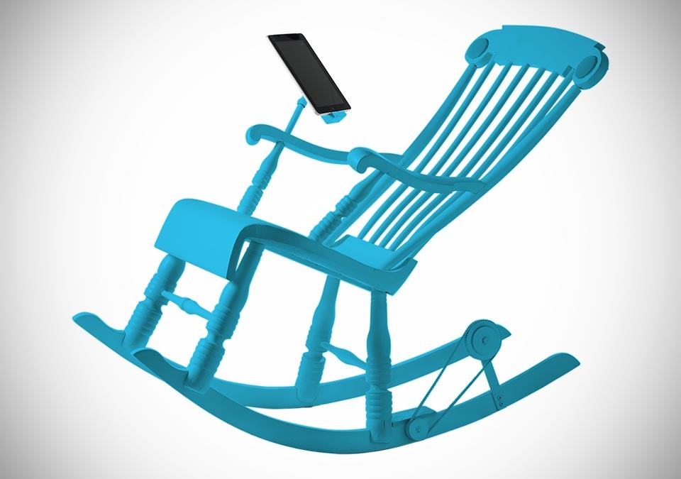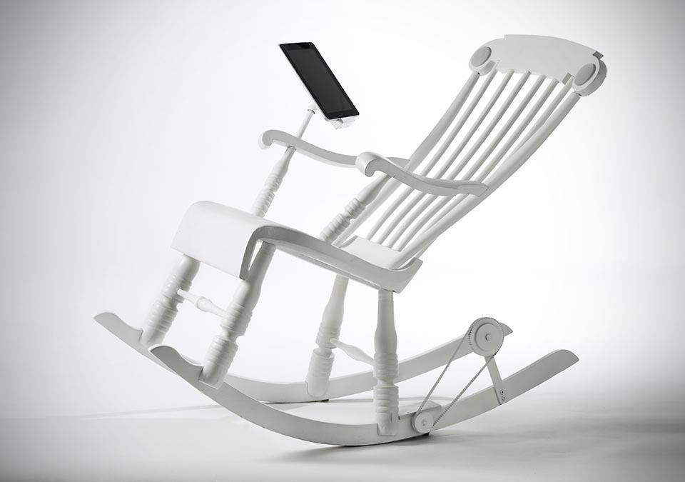 admit it: you do love to laze on a rocking chair while you surf or read with your iPad all day, don’t you? however, you gram’s rocking chair wouldn’t suit a geek like you. what you need is the iRock Rocking Chair, a rocking chair that generates power to charged up your iPad while you rock away, ensuring that the pad is constantly juiced for the long rocking day ahead. the chair features a generator that translates the rocking motion into useful electrical current for you device via a couple of gears and a belt, a discreetly integrated dock for your iPad that blends in with the chair’s aesthetic and a pair of speakers located on the head rest portion of the chair for your audio enjoyment. we can already see that we would be needing this when we get old, assuming Apple don’t change their docking connector design in another 20 to 30 years time. in the meantime, geeky grams might be interested in this rocking chair too and oh, the power generated from the rocking motion also powers the speakers as well. pretty neat, huh? expected to creep into the market sometime late 2013, the iRock Rocking Chair will be marketed by Micasa Lab with an estimate price tag of around €1,300 or about US$1,650) a piece. when available, you will have a choice of five colors: white, black, green, blue or red to choose from. click through for a few more few views, including a couple of closeups.