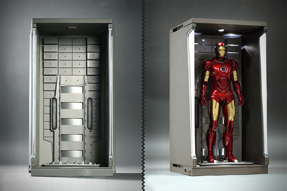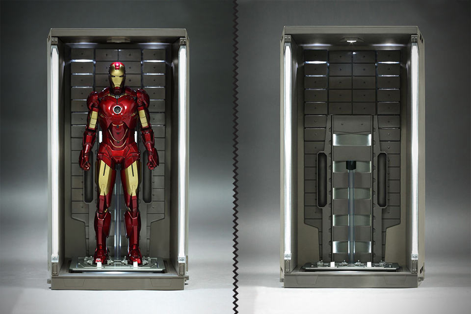 what's the next most iconic thing from the big screen Iron Man? we think that would be Stark's workshop where he stashes all his armor suits. with the movie-accurate Iron Man 2 Hall of Armor Collectible Diorama from Hot Toys, you can recreate Stark's uber cool home workshop to complement your collection