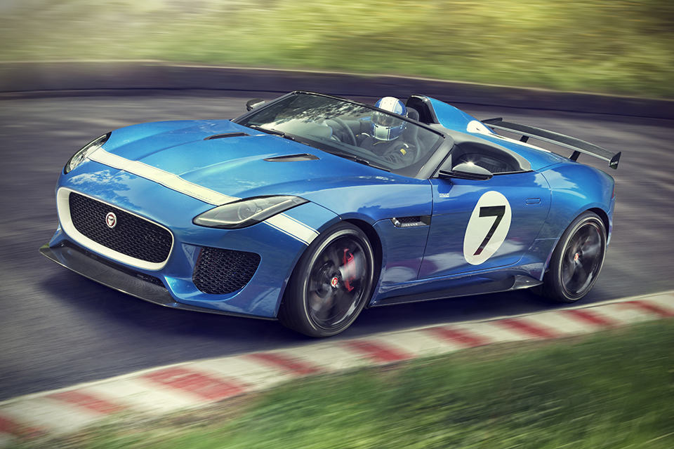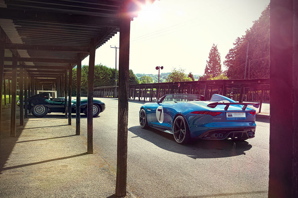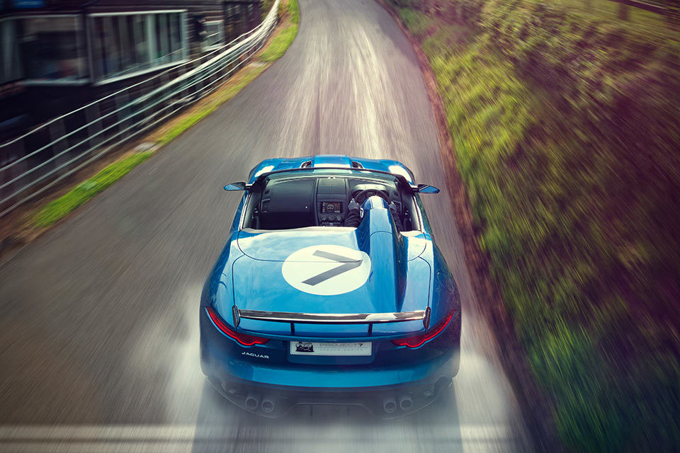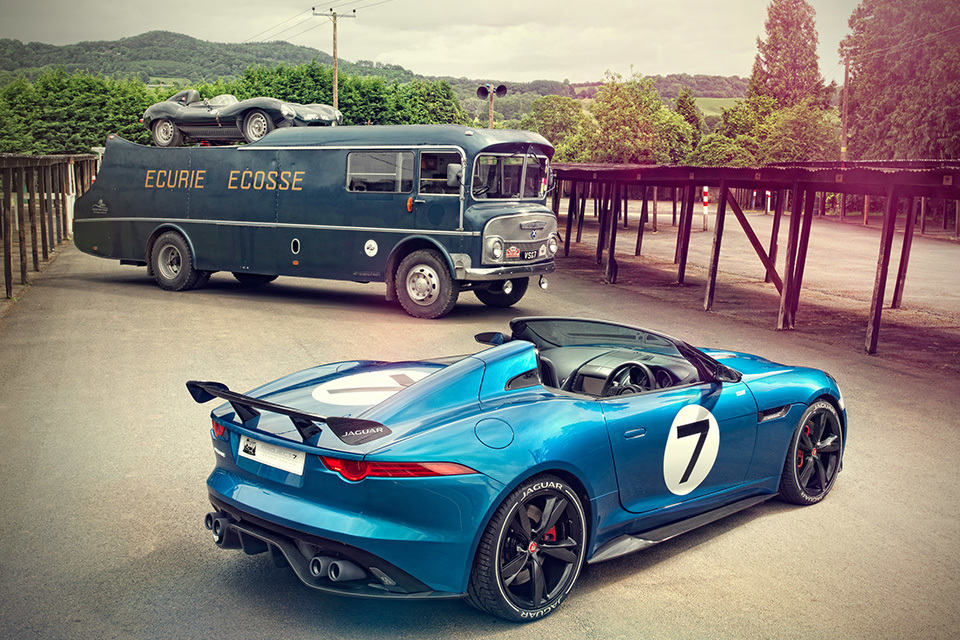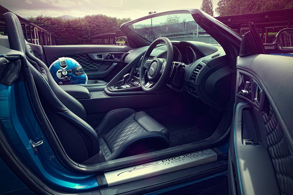 the Project 7 Concept was so named paying homage to the marque’s seven wins at the 24 Hours of LeMans between 1951 and 1990. and along with the tribute comes a styling that reminiscent of the victorious Jaguar D-types of the 1956/1957, such as the rear fairing with integrated rollover hoop behind the driver’s head and the blue paintwork. other features include an exterior with bespoke carbon fiber bits, a completely open top design with lower windscreen, a restyled front bumper, a single-seat configuration with four-point racing harness, a helmet holder in place of the passenger seat (with its own custom-designed Project 7 helmet), a ceramic finish free-flow exhaust system, and a tuned suspension with lower ride hide.