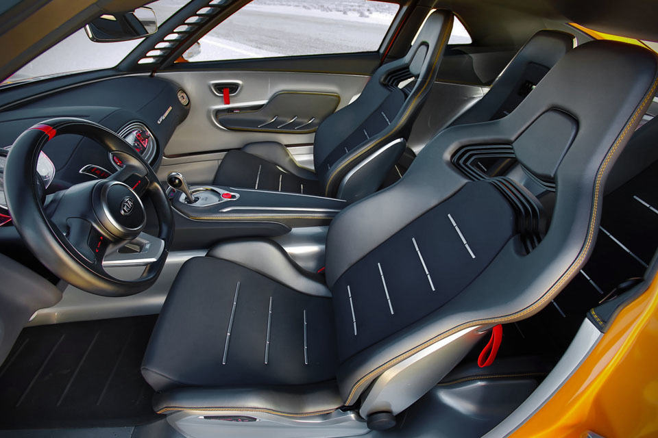coupe is no stranger to KIA, but the Koup hardly has the sports car look (it is just a two-door car and that’s that) and that’s not to mention the pretty standard performance you get with most KIA’s rides. that leaves the Korean automaker a void to fill by the KIA GT4 Stinger Concept you see here. sporting a ‘traditional’ sports car styling with long bonnet and short deck (or a wedge-shape design, if you prefer), this 2+2 sports car is powered by a proven 2.0-liter turbocharged T-GDI four-cylinder petrol unit (as used in the Optima), tuned to put out a healthy 315 horsepower, and mated to a close-ration six-speed manual transmission that sends those raw power to its big, fat rear wheels. speaking wheels, the Stinger sits on custom 20-inch aluminum center-lock wheels (!) with carbon fiber inserts, wrapped in 275/35R-20 Pirelli P-Zero performance rubbers for the rear and 235/35R-20 items up front.