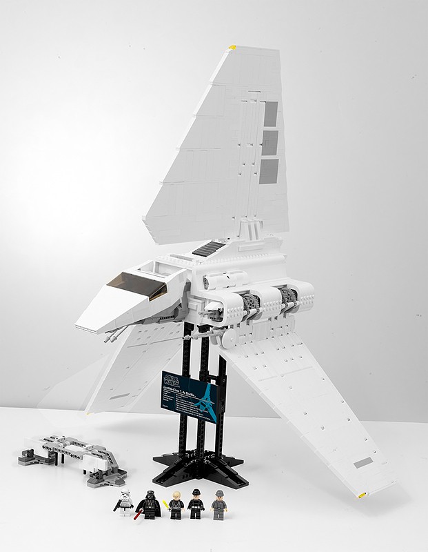 authentically detailed, this Imperial Shuttle is a true minifigure scaled vehicle and comes packed with five minifigures that include the evil sith Darth Vader, Shuttle Pilot, Imperial Officer, Storm Trooper and Luke Skywalker. naturally, being such an exquisite model, it also comes with a display stand, nameplate and label sheet. the model measures 28-inches (71-cm) tall on stand and 22-inches (57-cm) wide with winds fully deployed. i am totally sold. LEGO itself doesn’t come cheap, so naturally, an exclusive kit like this will set you back at $259.99. more images after the break.