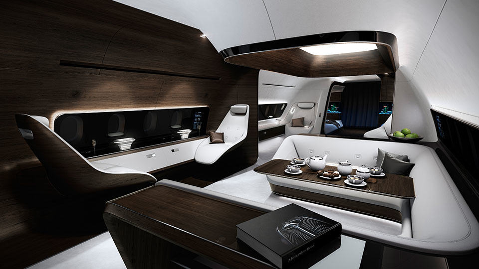 The design also integrates furniture like chairs, couch, tables and beds, as part of the “one-piece suite” concept. The result is a new sense of space, which is further accentuate Mercedes’ emphasis on contest in terms of material, color and lighting. And it is state-of-the-art too, adopting Mercedes-Benz Magic Sky technology on the windows which allow the windows to be electrically dimmed from black to transparent. These black panels can also be integrated with displays and touchscreens catering to travelers’ infotainment needs.