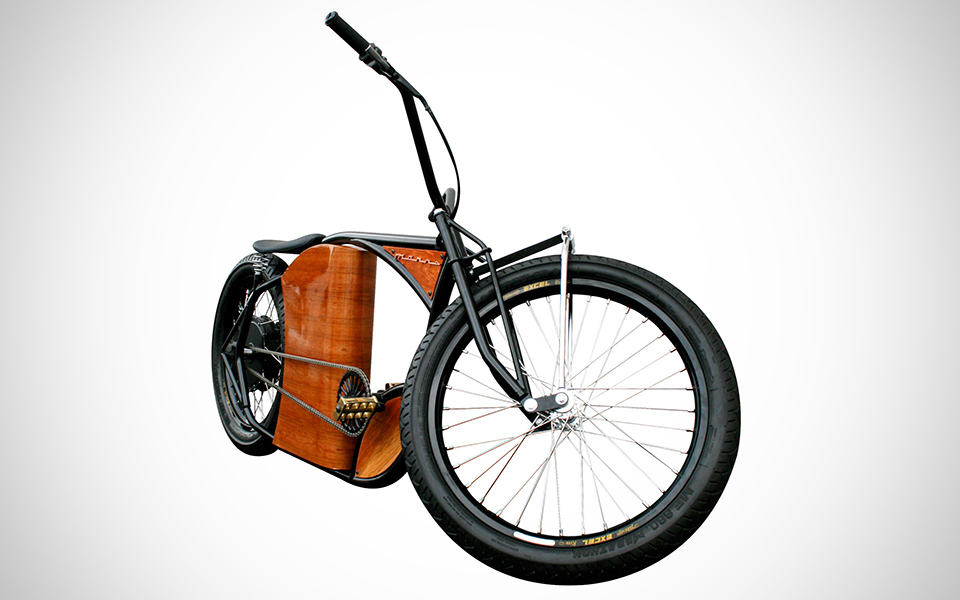 is this a bicycle or motorcycle? you will be forgiven to think that the M-1 Electric Bicycle from Marrs Electric Cycle Co. is a vintage Harley-Davidson but of course, it isn’t. breaking away from the regular (some say, conservative) design of electric bicycles, which are usually no more than just regular bike stuck with an electric motor and batteries, the M-1 sports a rather radical design that harkens back to the olden day choppers. apart from its standard issue pedal-powered drive train, it is fitted with a three-phase brushless rear hub motor and powered by rechargeable lithium battery packs. when on full motor power, the smallest battery pack of 20 amp hours is said to offer a range of about 32 km (20 miles) and a top speed of 32 km/h (20 mph). the 32 km/h top speed is about the maximum it could go in order for it to still fall into the electric bicycle category in State side. the bike is built to order, allowing customers to choose from the available frame colors and wood veneer types. the M-1 Electric Bicycle is handcrafted from 4130 chromoly steel with a mixture of components taken from high-end motorcycle, bicycle, as well as custom-made parts, which explains its hefty asking price of at least $7,000 – a price that is reserve for the serious tree huggers or ebike enthusiasts with eyes for vintage styling – and with lots of cash to spare. join us for a gallery of the M-1 Electric Bike after the break.