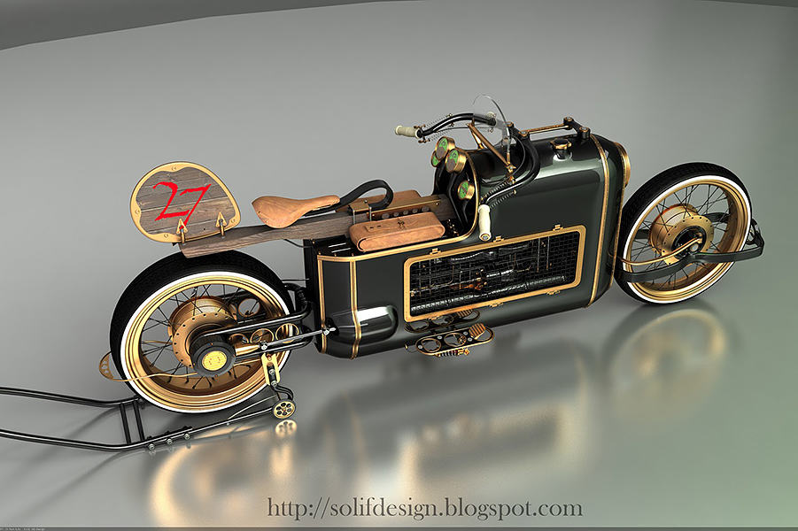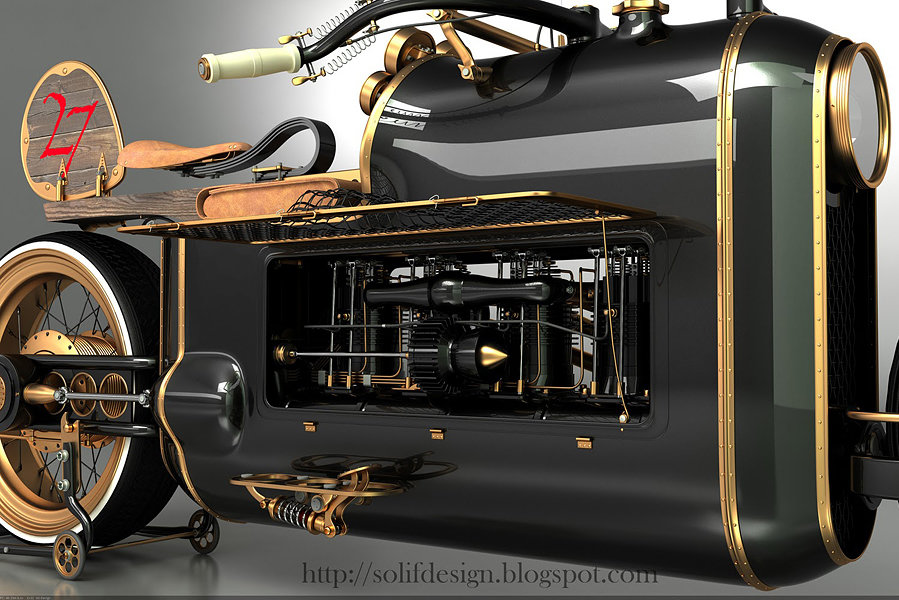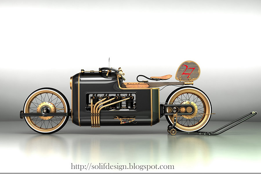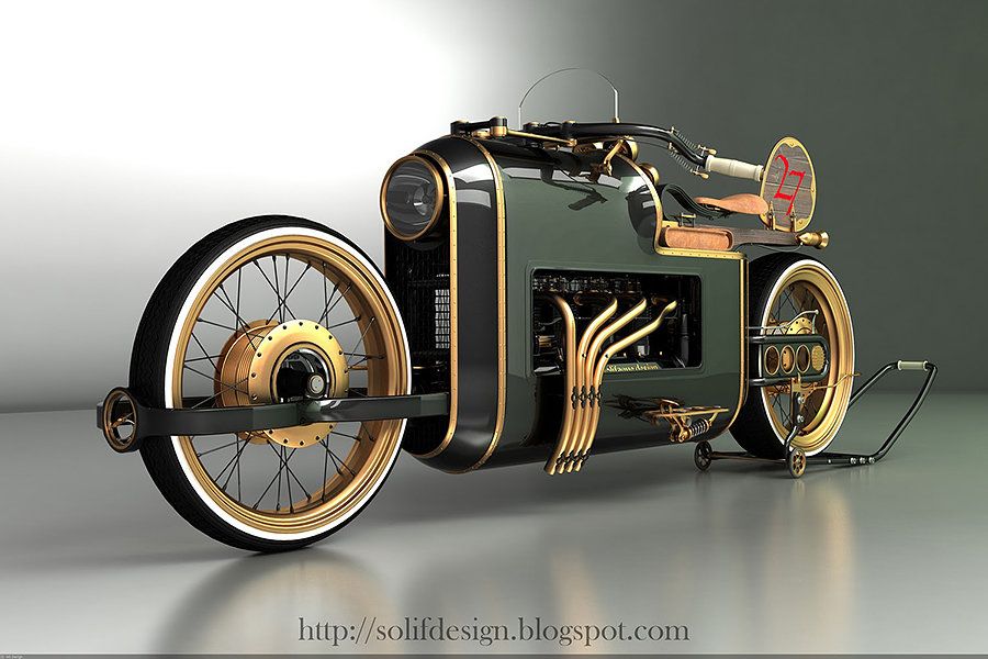 i can’t help but to feel that there might be a steampunk revolution going on. almost any conceivable items in our lives are given the steampunk treatment – everything ranging from computers to mobile phones to the creepy crawlies, have been touched by steampunk midas around the world and now, we witness yet another gorgeous steampunk concept and its name is the ARX-4 Steampunk motorcycle. created by one Mikhail Smolyanov, who took inspiration from airplane engine equipped race cars of the 20s era for his ARX-4 concept. in this concept, a V8 engine powers the wheels that move via drive shaft instead of traditional chain link or belt drive. though, a concept but it is still quite a sight to behold. Mikhail’s concept is a modern iteration of what a steampunk would be in today’s context, else it would have been driven by steam engine which would equate to sitting on a time bomb – literally. check out a few more images of this awesome concept steampunk motorcycle after the break.