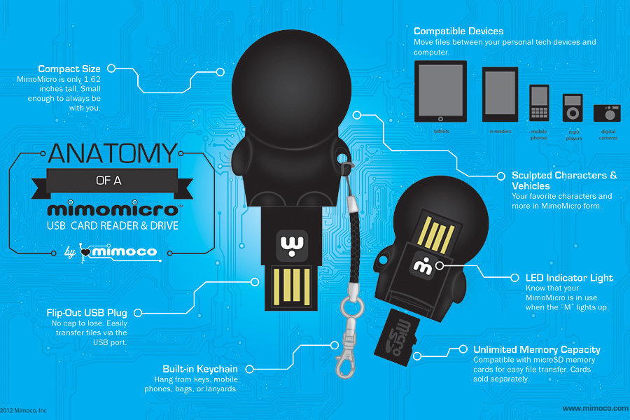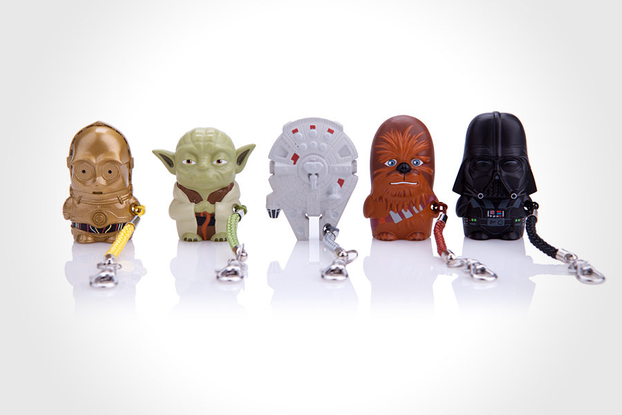USB flash drives are a dime a dozen, hence it is hard to stand out other than going on the price war or stamping your mark of reliability on them. speaking of which, if you are not a business suited corporate head, you probably don’t need a too run-of-the-mill, mundane looking USB flash drives and instead, you can choose to treat yourself with something with little more cute factor like the MimoMicro USB Card Reader and Drive from Mimoco. showcased in the ongoing CES 2012, the MimoMicro product line is touted to be smaller, and more versatile than its Mimobot counterpart. It is a USB flash drive with interchangeable microSD memory cards and it also works just as well as a standalone microSD card reader. some of the features include cap-free design with flip-out USB plug, integrated keychain, and LED indicator. like the recent Mimobot, the MimoMicro line also goes on the cobrand route, with the first series featuring characters from Star Wars and DC Comics. Fans of these two popular franchises can expect Star Wars designs that include Darth Vader, Yoda, C3-PO, Chewbacca, the Millennium Falcon along with DC comics character, Batman, Superman, and Wonder Woman. the MimoMicro USB Flash Drive and Card Reader is slated to hit the stores this March, though price remain a mystery at the time of this posting. a few larger views after the break.