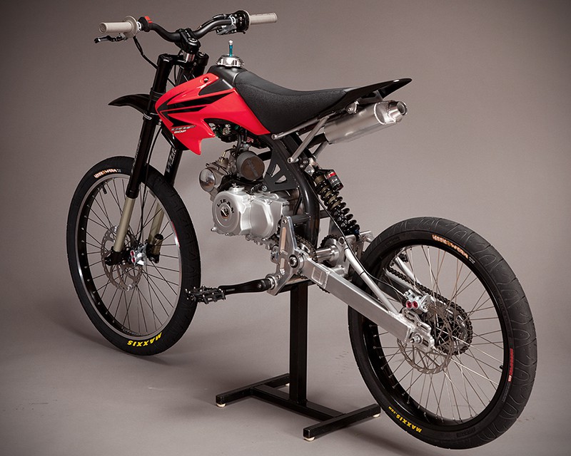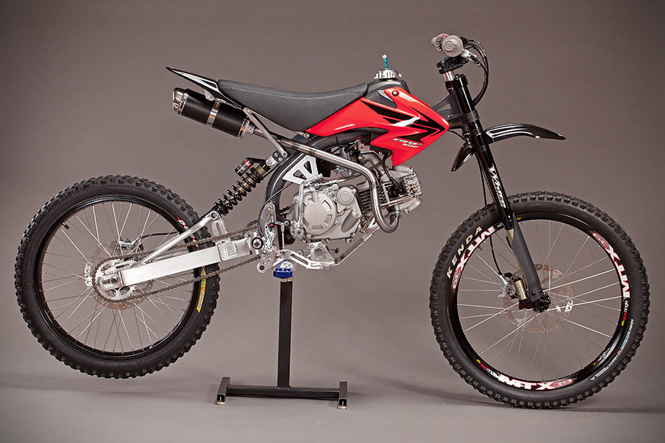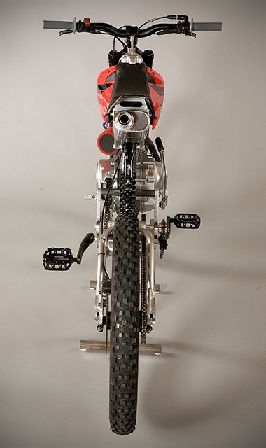 what happens when you cross a mountain bike with an off-road bike? unthinkable, as any mountain biking purists would have said, but as for the rest who wants a little more oomph in their trail biking experience, Motoped Motorized Bicycle Kit is the way to go. the Motoped Motorized Bicycle Kit, as the name suggests, exist as a kit which comprises of a made in USA chromoly tube frame, swing-arm, sprockets, custom made rear hub, 3/4″ steel jack shaft, and a custom 1″ exhaust system. as you might have already noticed, you will still be needing quite a few other parts to realize the skinny off-road bike dream and that includes a downhill mountain bike ready to be cannibalized and parts like engine, fuel tank, seat, fairings, and throttle from a Honda SR50 or a Chinese pitbike donor.