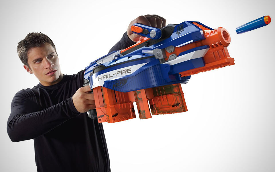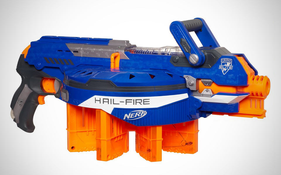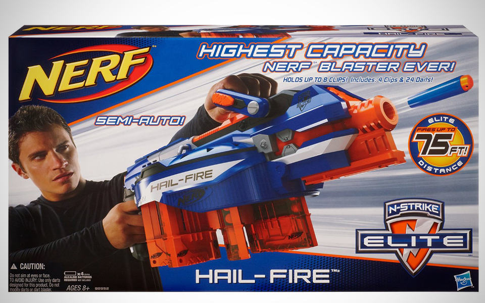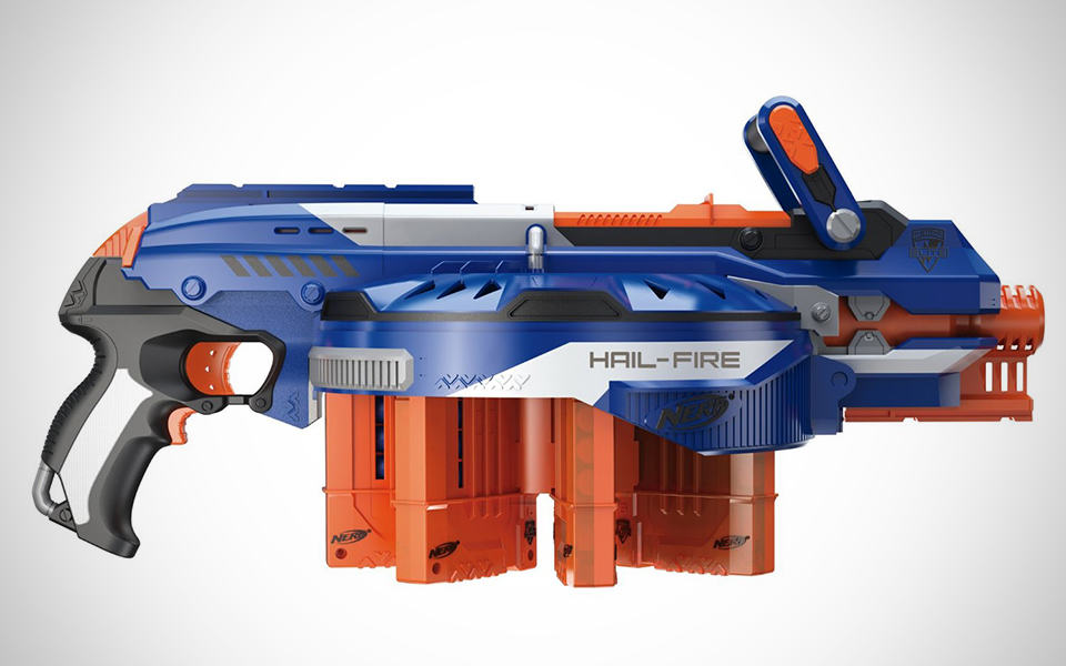 your days of outdoor fun are numbered, so it is wise to pick up things a little with the Nerf N-Strike Elite Hail-Fire Blaster. instead of the usual single magazine for the Nerf darts, the Elite Hail-Fire Blaster hold up to eight Quick Reload clips on its unique rotating ammo rack, letting you send up to 144 Elite Darts up to 75 feet (23 meters) downrange. it offers two ways to unload the Elite Darts at your opponents: pull the Launch Trigger as fast as you can for a more controlled shots or hold down the Acceleration Trigger to activate the built-in motor for an insane semi-auto induced carnage. and when you are done with one clip, just hit the Advance Handle to advance the Rotating Ammo Rack to the next clip and you all set. a pair of tactical rails come standard on the Elite Hail-Fire Blaster, allowing you to further accessorize it with Nerf N-Strike accessories. isn’t that sweet? the Nerf N-Strike Elite Hail-Fire Blaster can be yours for $49.99 a pop. additional clips, darts and the required AA alkaline batteries are not included. check out some larger views after the break.