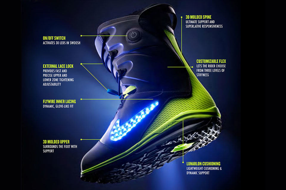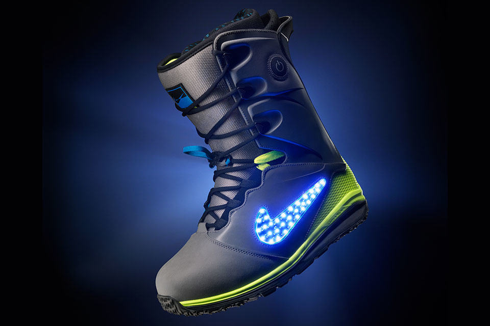 nobody snowboard in the dark. what? you do? well, then why not put up a light show while you at it with this pair of rad Nike LunarENDOR QS Snowboard Boots? taking center stage is a set of 30 LEDs that lights up the iconic swoosh sign, powered by an embedded lithium-ion battery, with an on/off switch conveniently located at the cuff of the boot so you quickly flip on or off while doing the grab or whatever. attention-grabbing LED aside, the Nike LunarENDOR QS Snowboard Boots is also no slouch when it comes to boot-built and is billed as the “most technologically advanced snowboard boots” available today. packed within its futuristic form is Nike Lunarlon foam (hence, the namesake) that offers a softer, more responsive ride, while also absorbing some of the impact during landings, which are inevitable in the sport of snowboarding.