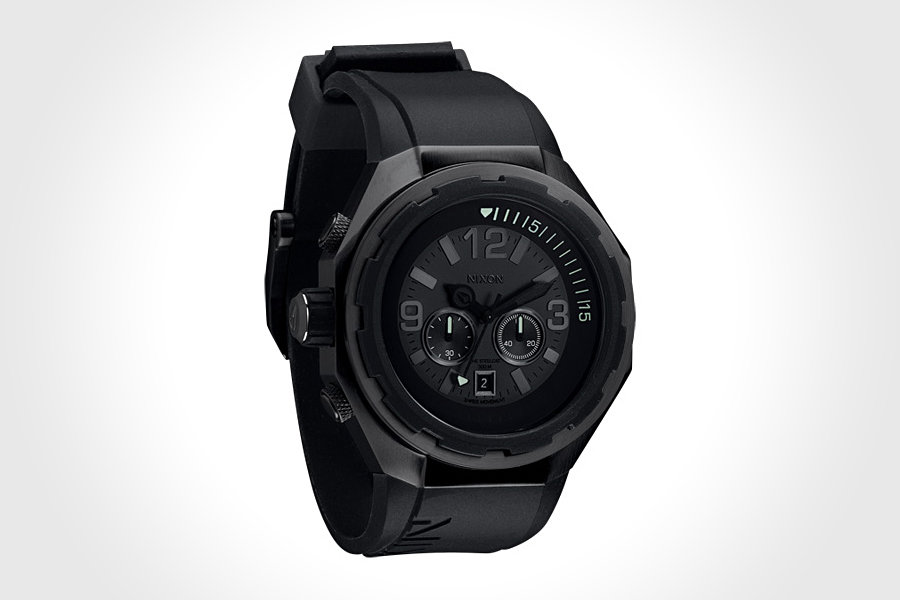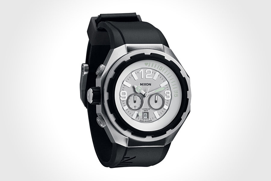 often we admire the beauty of luxury timepieces, knowing that we probably won’t be able to splurge on such luxury but lucky for us, there’s a ‘go between’ like the upcoming Nixon THE STEELCAT Chronograph Watch. brand name and stature aside, this watch lures our attentions away from who the maker is behind it. not surprisingly, Nixon takes its design cue from luxury brand name like Hublot and Audemars Piguet, and the result is what you see here: THE STEELCAT. the watch features a 5-hand SWISS Quartz chronograph movement, a custom 48mm stainless steel case, domed sapphire crystal, rubber bezel, screw down crown, silicone strap with molded stainless steel hardware, and water resistant up to 300-meter depth. available in three colorways: All Black, Rose Gold/Black, and White, THE STEELCAT is destined to be in Nixon’s Spring 2012 Collection with a price tag of just $650. not exactly cheap but hey, it is still affordable when compared to a five figure Hublot. doesn’t it? check out a few more look after the break.