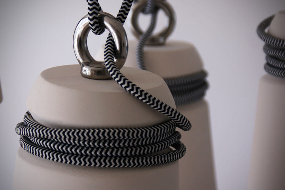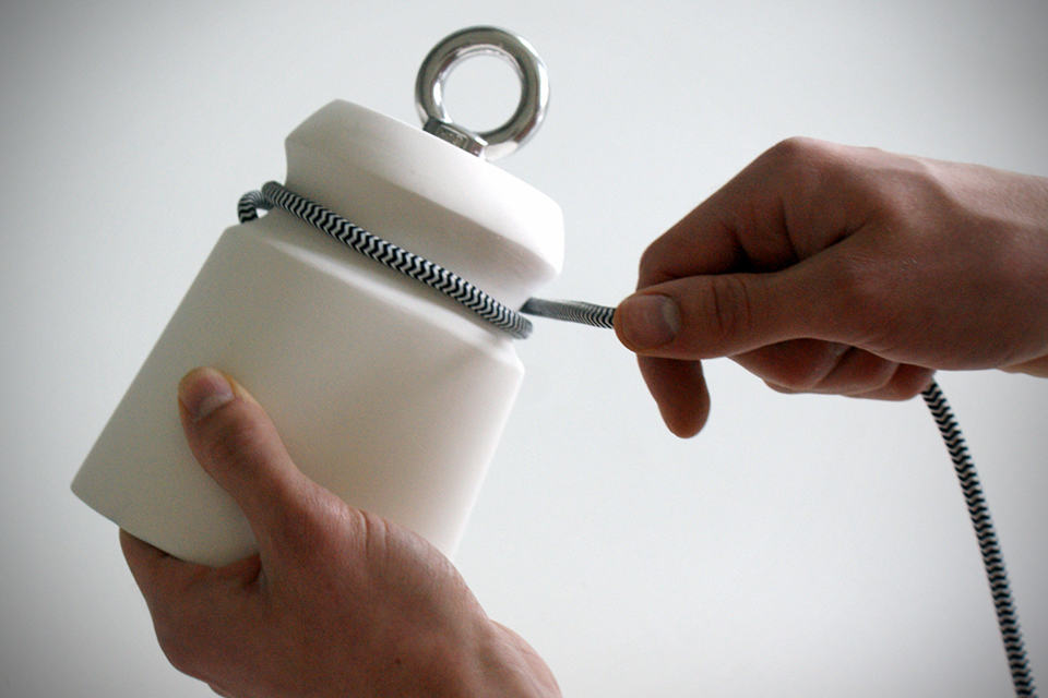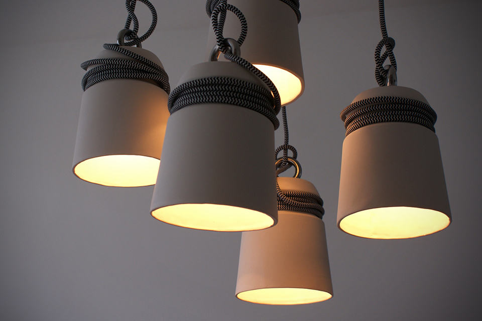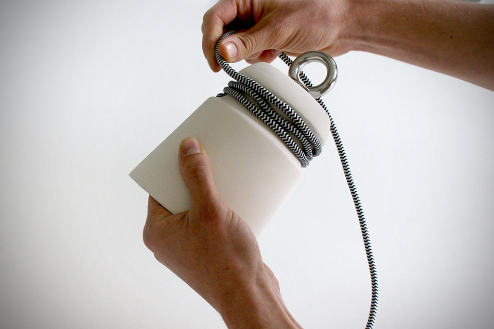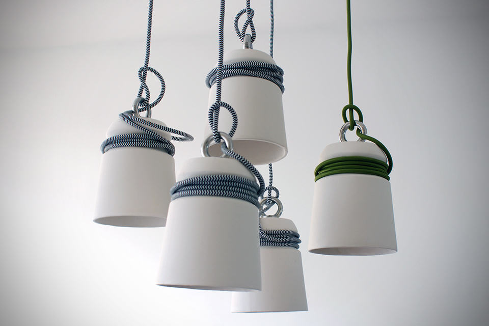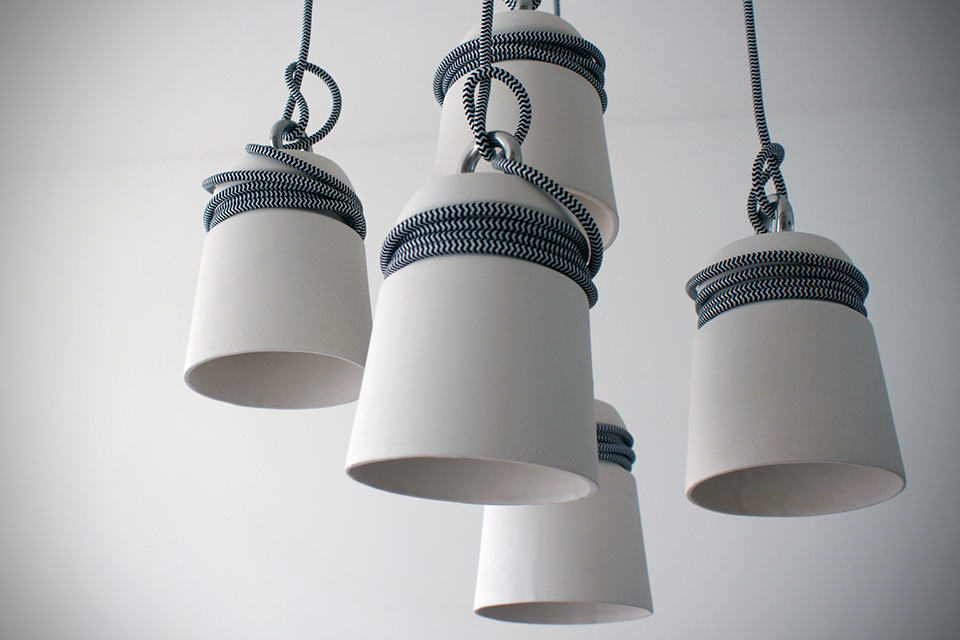 need a conversational piece on your ceiling? then these Patrick Hartog Ceramic Cable Lights might be worthy of your exploration. inspired by the mooring bollards found at docksides or wharves, designer Patrick created these lights by slip casting and like a boat moored to the real bollards, they have cables would around them replicating the moored-look (and hey, your ceiling is the boat!). a metal ring perched on top of each shade ensures the light is balanced when its up there. as far as customization goes, each lamp can be individualized with different colored or patterned cables and placed at varying height to create a beautiful chandelier-like form. of course, the lamp could be use as individual lighting, or as mentioned, group together for a more pronounced presence. either way, it certainly breaks the monotony of traditional lightings. each lamp measures 15 cm tall and 12 cm across (diameter) or about 5.9 inched tall by 4.72 inches. however, if you think the size is a tad too small for your application, no worries, just hold out a little longer as Patrick is working on a larger version. in the mean time, if you are keen on the Patrick Hartog Ceramic Cable Lights, you can contact Patrick with your request via his official website HERE. hit the jump for a few more look.