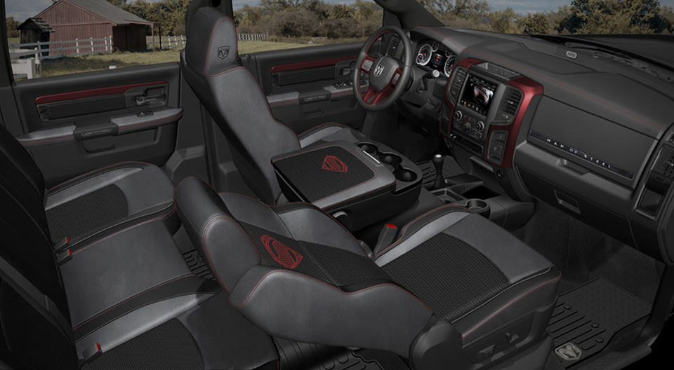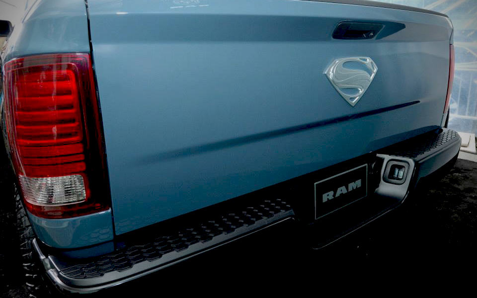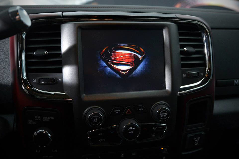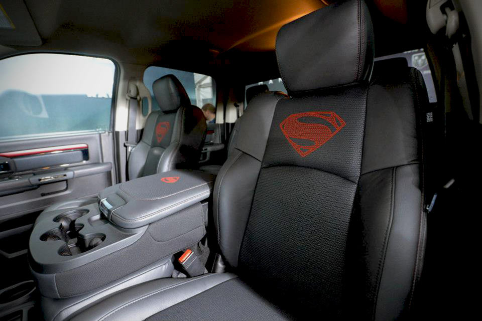 as you would have imagined, much of this one-off power wagon are cosmetics and featuring a Dark Ceramic Gray paint job, topped off with a custom wrap inspired by the rebooted Superman’s suit. other exterior features include a high-gloss black roof which you probably never get to see, anodized red grille accents, forged aluminum 17-inch black wheels, and of course, the new Superman emblem which can be found on the front, tailgate as well as on the doors where the RAM logo would be. on the inside, you find pewter leather seats with custom mesh inserts (again, inspired by the superhero’s suit), anodized red paint trim accents on the doors, steering column, radio cluster and seats, and Superman branding can also be found on the seats, console, glovebox and even the screen backdrop and startup screen on the radio cluster. basically, it is probably a dream ride for any Man of Steel fans.