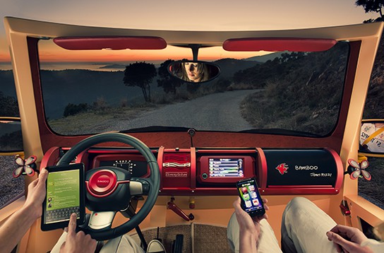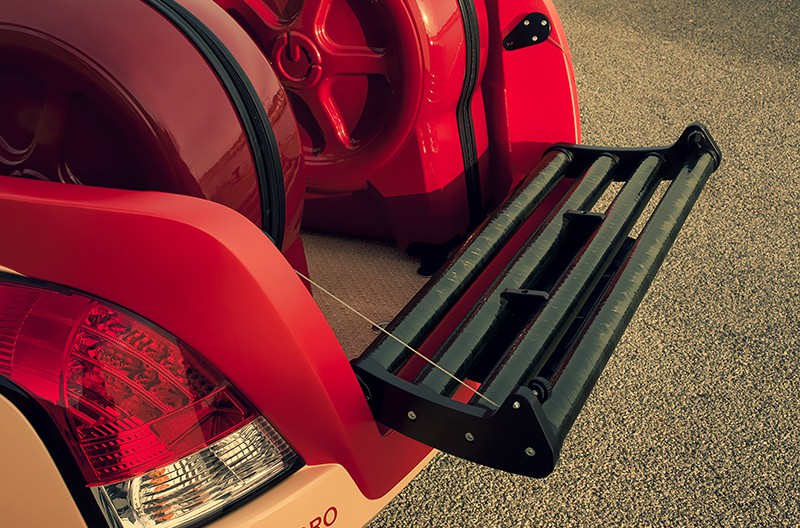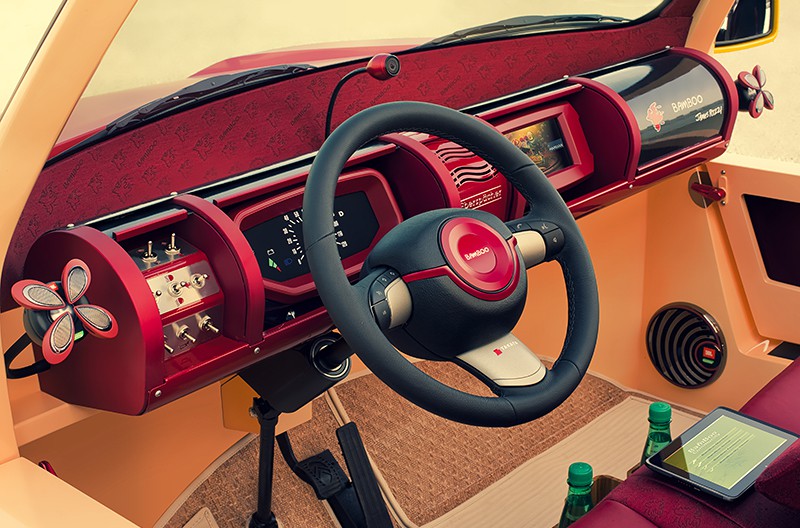 the Bamboo Concept now goes on an ‘open concept’ which aims to further entice the driver and its occupant to get in touch with the nature. the pair of rear seats and the roof are detachable inflatables which can be removed as and when needed. if you loathe getting your bum all dirty from the sandy beach, no worries, remove the rear seats and use to keep your butt all nice and comfy. developed by Swiss firm Technotex, the roof is treated with water-resistant coating and can be readily removed, deflated and turned into a beach blanket. the integrated blower on board allows inflation of the roof and the seats.